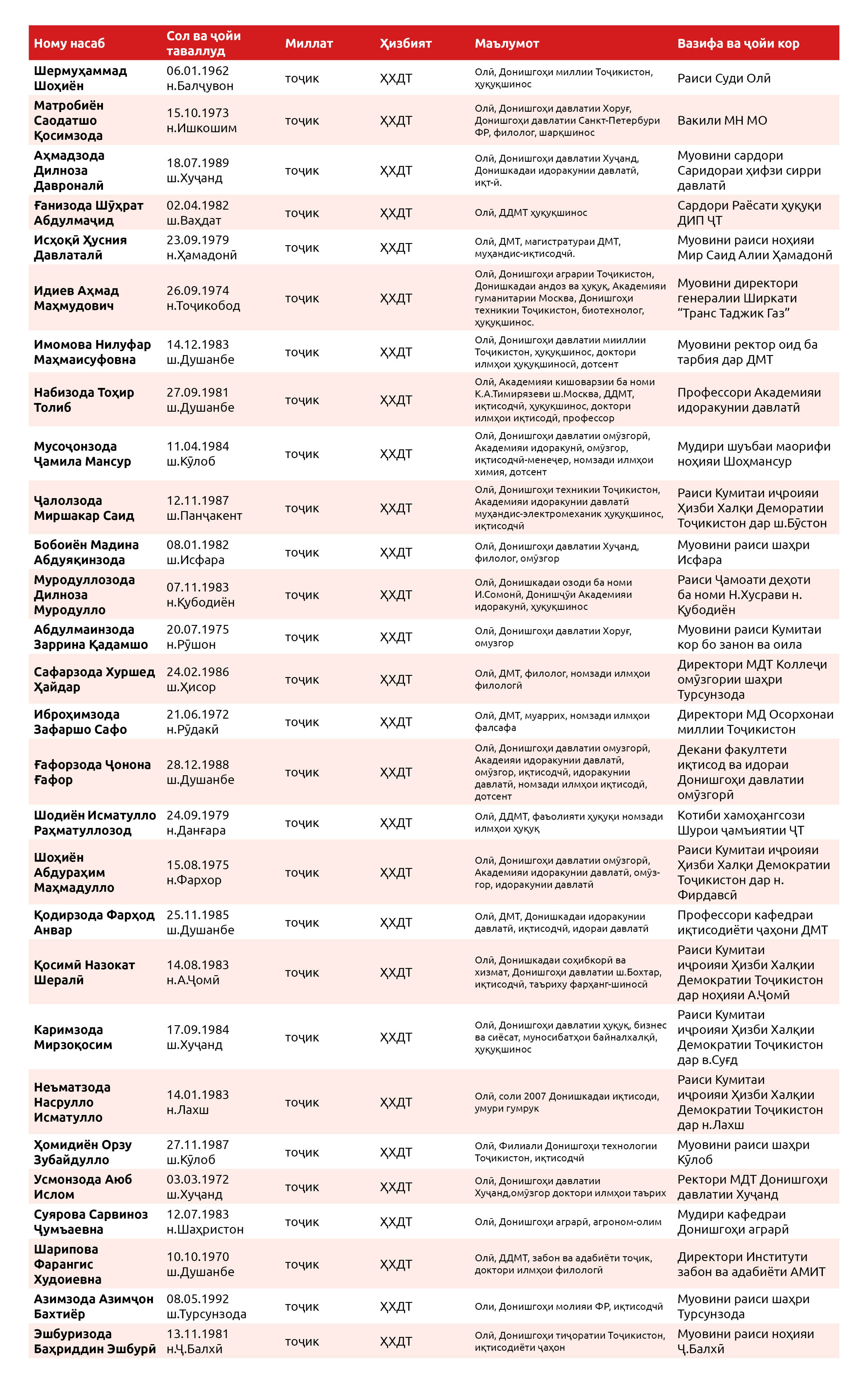 Аз вакилони ҳозира танҳо номзадии Матробиён Саодатшо пешниҳод шудааст. Аз мансабдорони баландмақом танҳо исми Шермуҳаммад Шоҳиён, раиси Додгоҳи олии Тоҷикистонро вохӯрдан мумкин аст. Боқимонда, расиони кумитаҳои ҳизбӣ дар шаҳру навоҳӣ ва омӯзгорону мансабдорони сатҳи маҳаллӣ мебошанд.