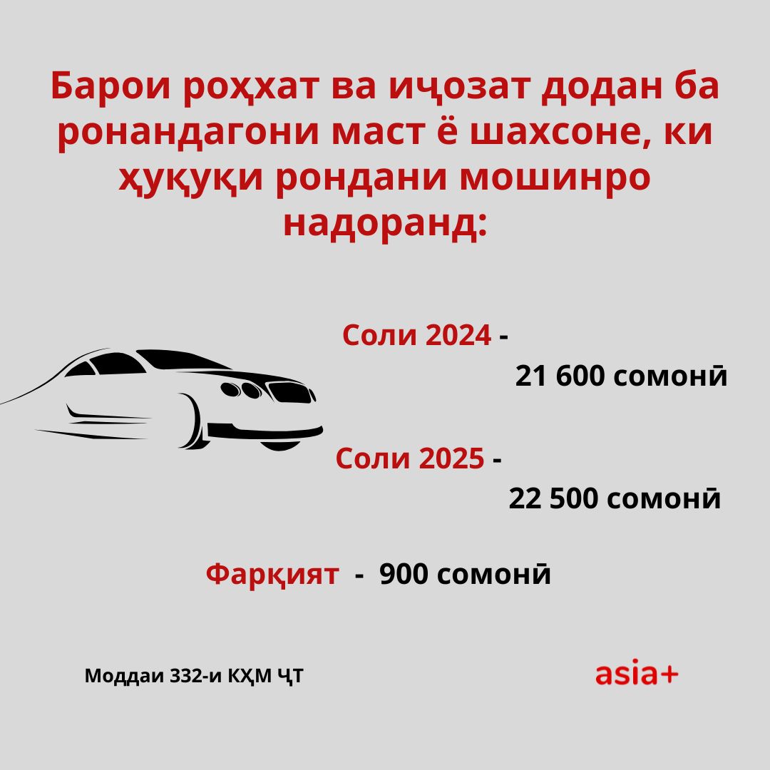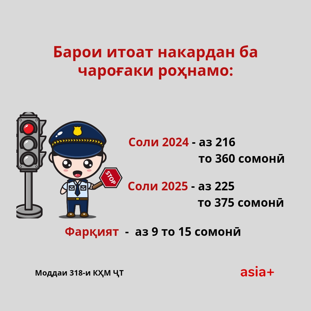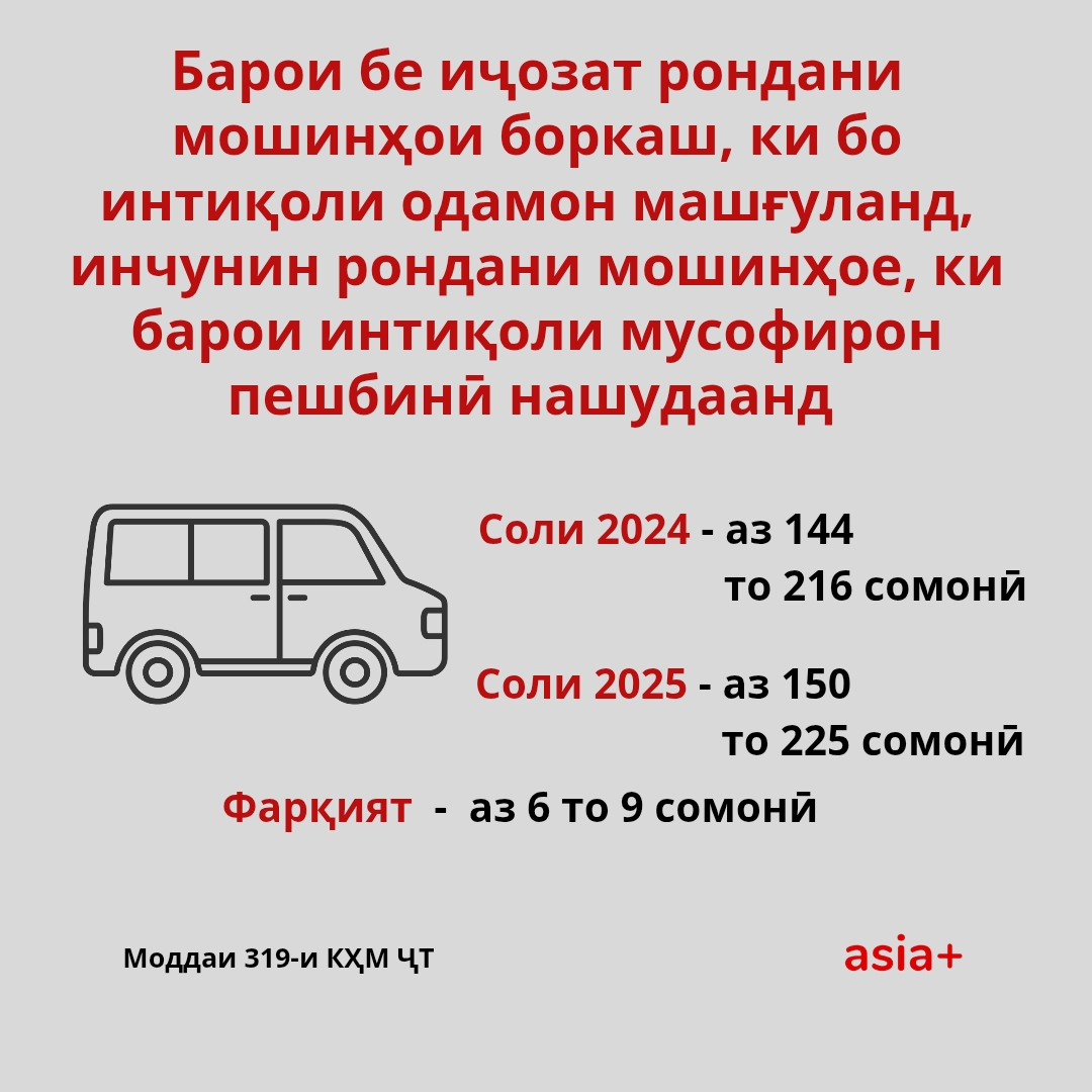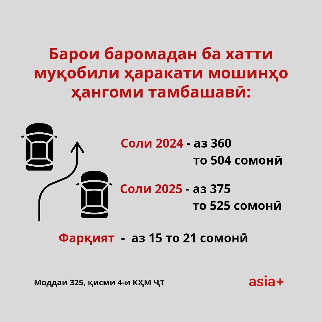 Ба иттилои Вазорати нақлиёти кишвар аз 1-уми январи соли 2025 андозаи ҷаримаҳо барои ронандагон ва ширкатҳои нақлиётӣ барои вайрон кардани баъзе қоидаҳои ҳаракат дар роҳ афзоиш ёфтааст.