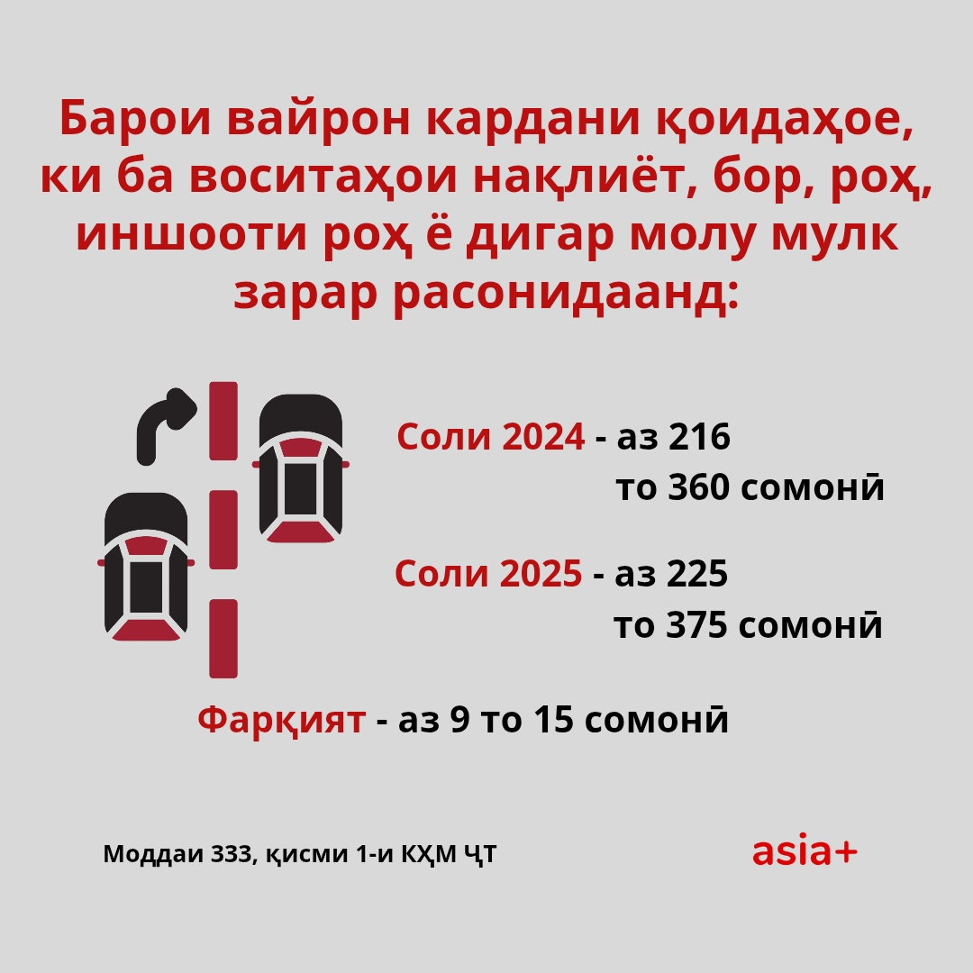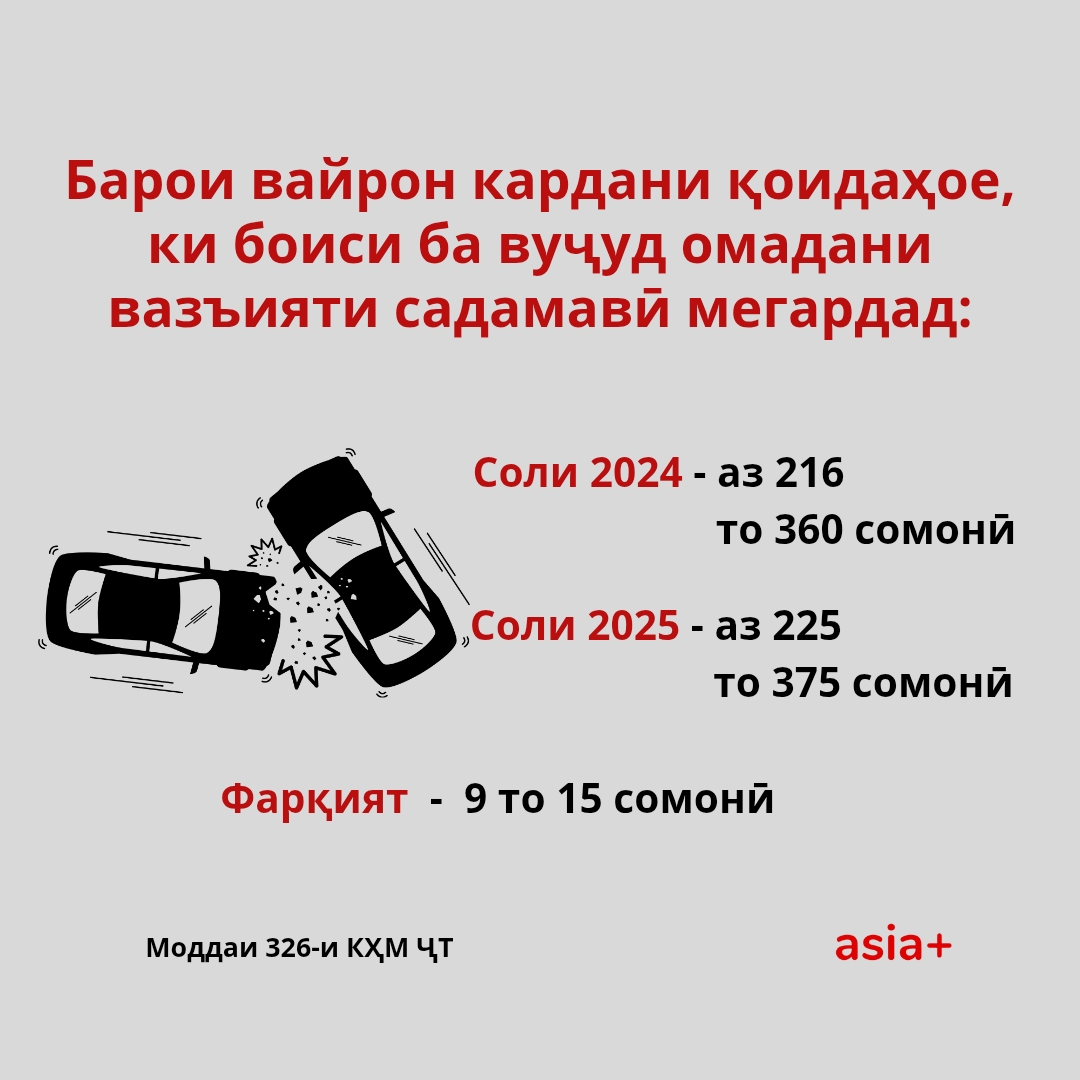 “Азия-Плюс” чанде пештар дар бораи он ки шуруъ аз соли равон меъёри ҷарима барои кадом қонуншиканиҳо, махсусан қоидавайронкуниҳои ҳаракат дар роҳ баланд шуд, маводи алоҳида нашр карда буд, ки онро метавонед тариқи ин линк хонед.