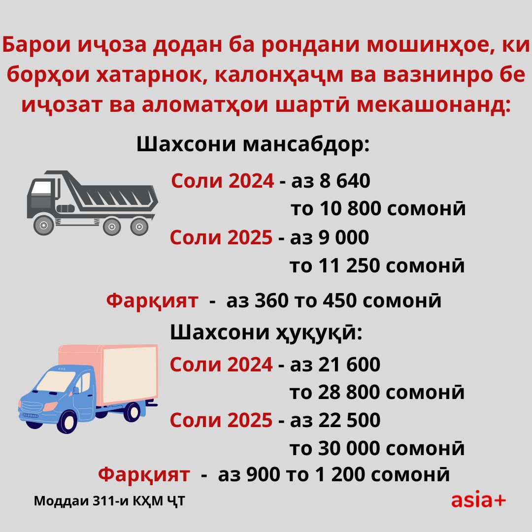 Вазорати нақлиёти Тоҷикистон гуфтааст, аз аввали соли 2025 андозаи ҷаримаҳо барои вайрон кардани қоидаҳои ҳаракат дар роҳ ҳам барои ронандагон ва ҳам барои ширкатҳои нақлиётӣ зиёд шуд. Аз ҷумла, ронандагоне, ки борҳои хатарнок, калонҳаҷм ва вазнин мекашонанд, акнун ҷаримаҳои сангин мепардозанд.