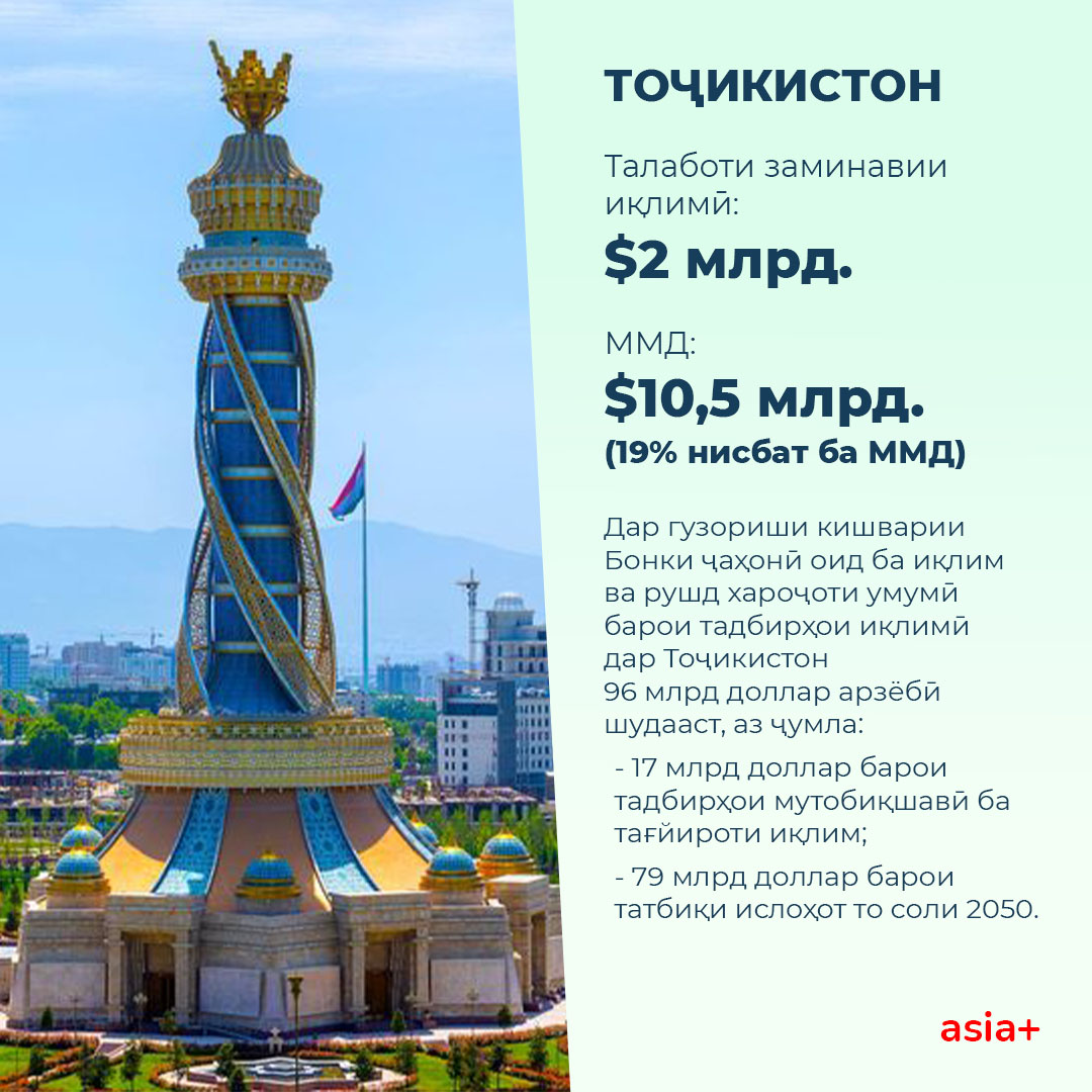Дар гузориши кишварии Бонки ҷаҳонӣ оид ба иқлим ва рушд хароҷоти умумӣ барои тадбирҳои иқлимӣ дар Тоҷикистон 96 млрд доллар арзёбӣ шудааст, аз ҷумла: