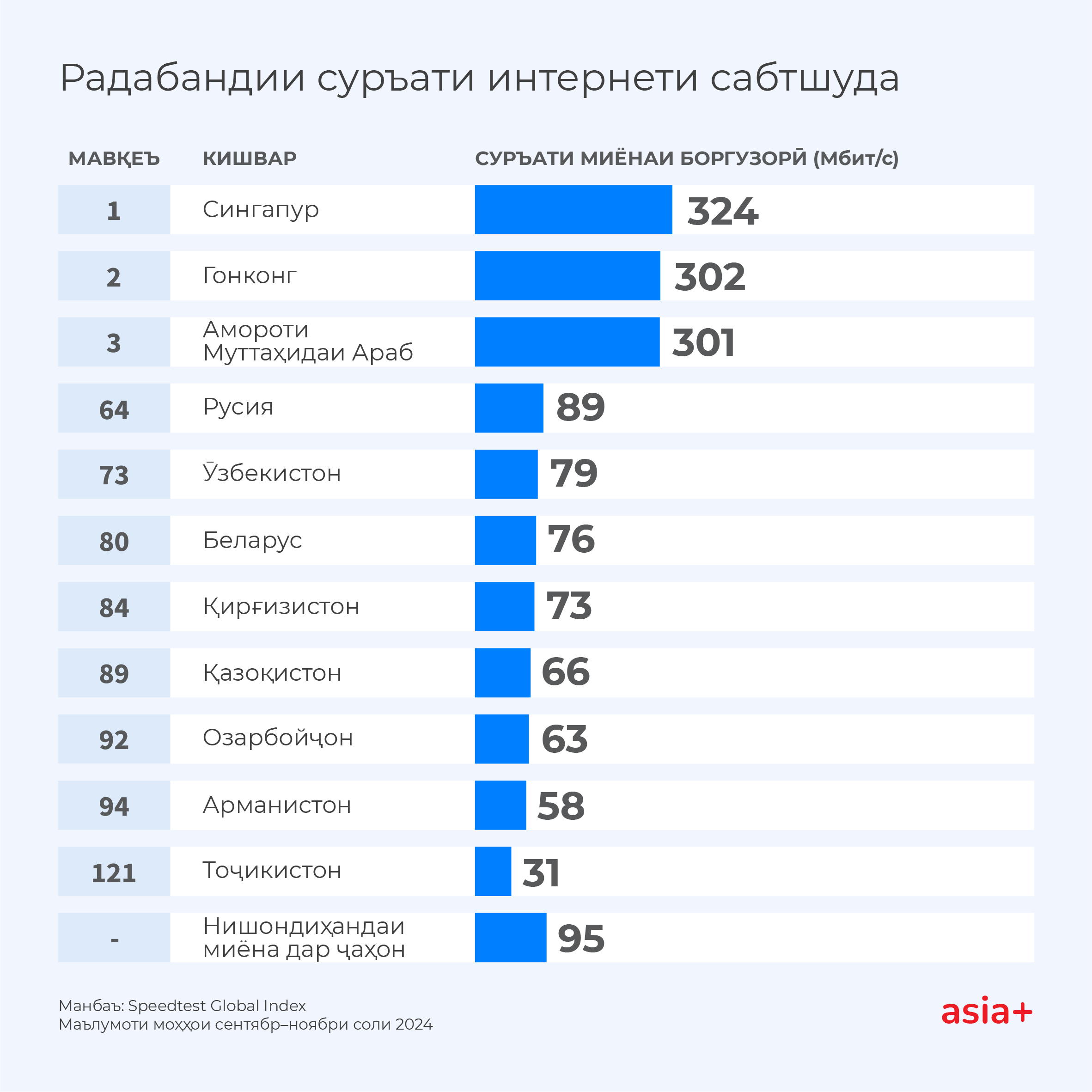 Инчунин мавқеи Тоҷикистон дар муқоиса бо кишварҳои ҳамоя низ хеле паст аст: Ӯзбекистон (зинаи 73-юм, 79 Мбит/с), Қирғизистон (зинаи 84-ум, 73 Мбит/с) ва Қазоқистон (зинаи 89-ум, 66 Мбит/с).