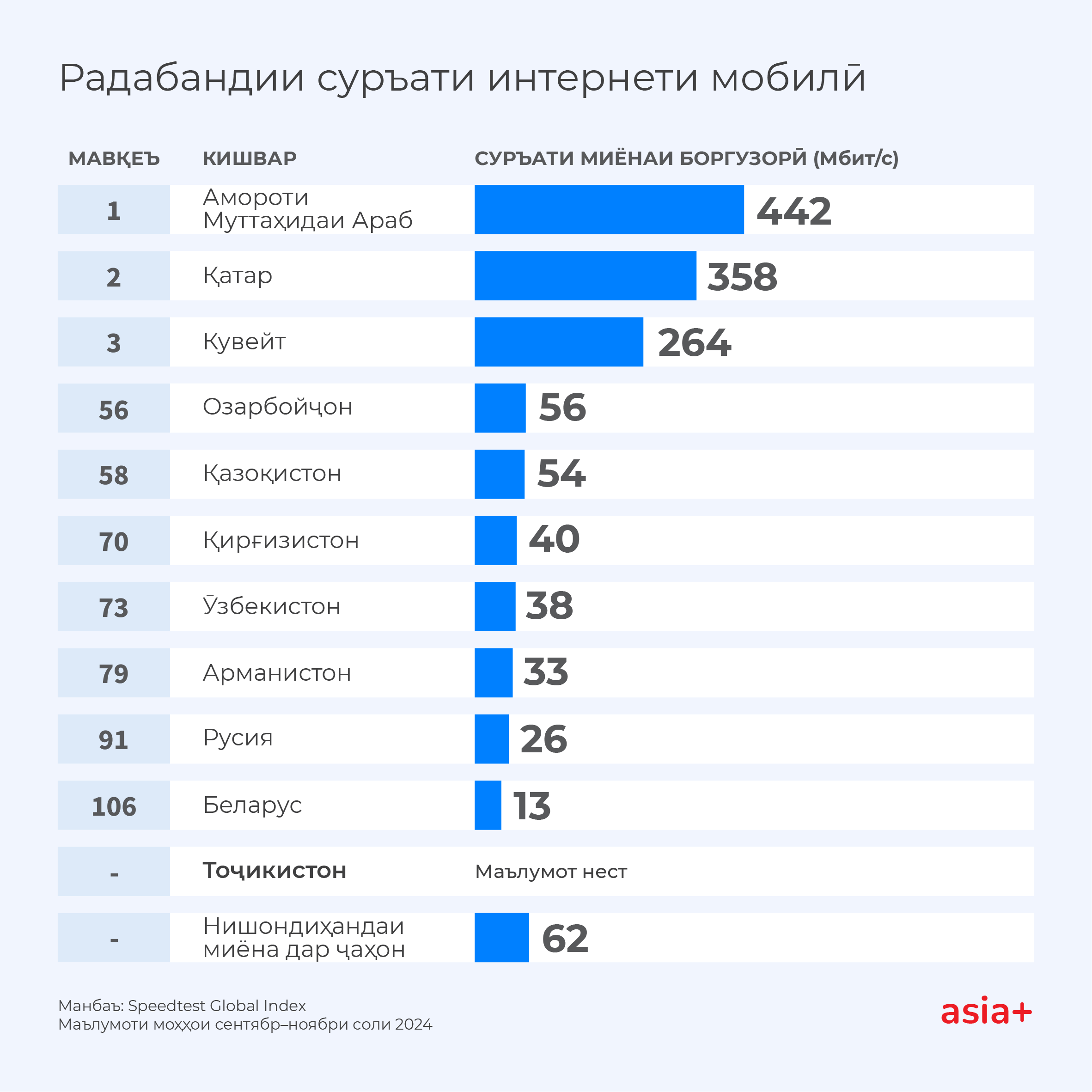 Маълумот дар бораи суръати миёнаи интернети мобилӣ дар Тоҷикистон дар давраи моҳҳои сентябр-ноябр пешниҳод нашудааст.