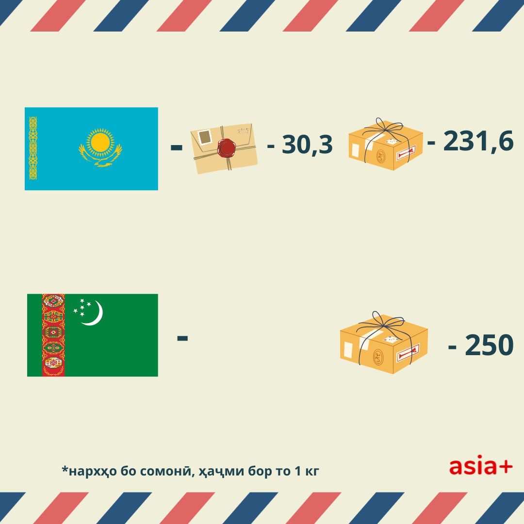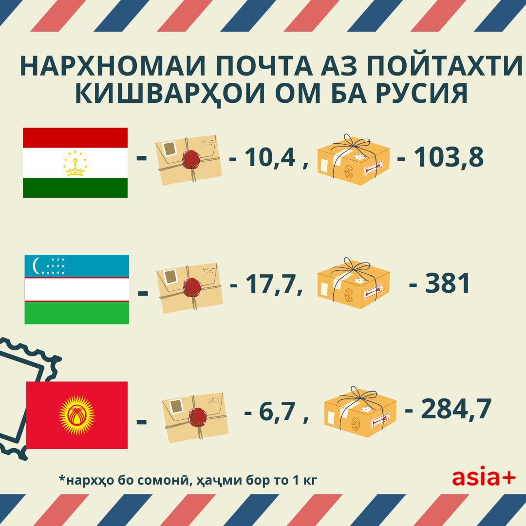 Нархи хидматрасонии Почтаи тоҷик низ нисбат ба дигар почтаҳои давлатии кишварҳои Осиёи Марказӣ гаронтар аст. Барои санҷиш, мо қимати ирсоли мактуб ва борро аз пойтахтҳои Осиёи Марказӣ ба Маскав муқоиса кардем.