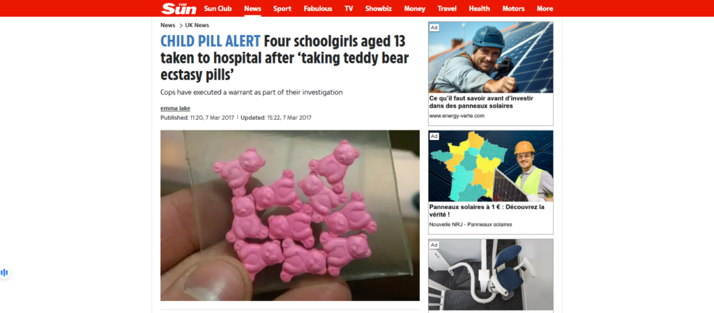 Ба навиштаи сомонаи Snopes (бойгонӣ) ин акси MDMA (як навъӣ маводи мухаддири сунъӣ, ки аксар вақт экстази ё Молли номида мешавад, барои саломатӣ хатарнок аст) аст, 2016 дар сомонаҳои марбут ба маводи мухаддир (таҳти номи ”Purple Bears w/ 180mg MDMA”) пайдо шудааст, аммо на ба хотири байни кӯдакон паҳн кардан нашр шудааст.