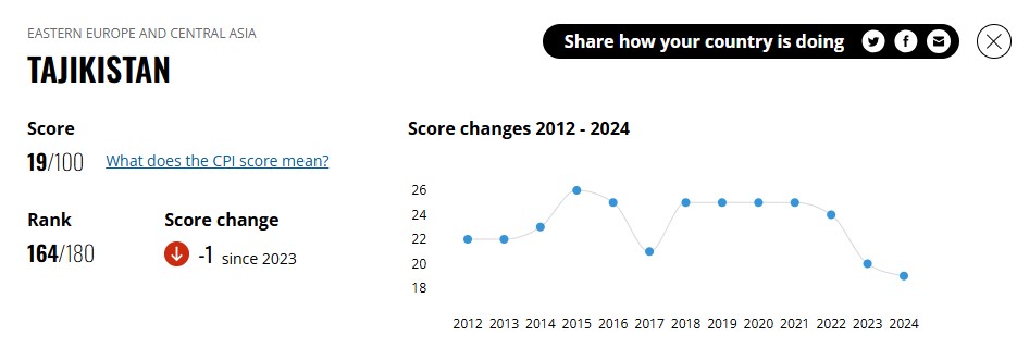 Дар соли 2024 Тоҷикистон 19 хол гирифт, ки дар муқоиса бо соли гузашта як хол камтар аст. Ин нишон медиҳад, ки кишвар дар миёни 180 давлат дар зинаи 164-ум қарор дорад.