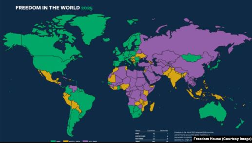 Чунин маълумотро муаллифони гузориши “Freedom in the World 2025” овардаанд, ки ҳамасола аз ҷониби созмони байнулмилалии ғайриҳукуматии Freedom House нашр мешавад.