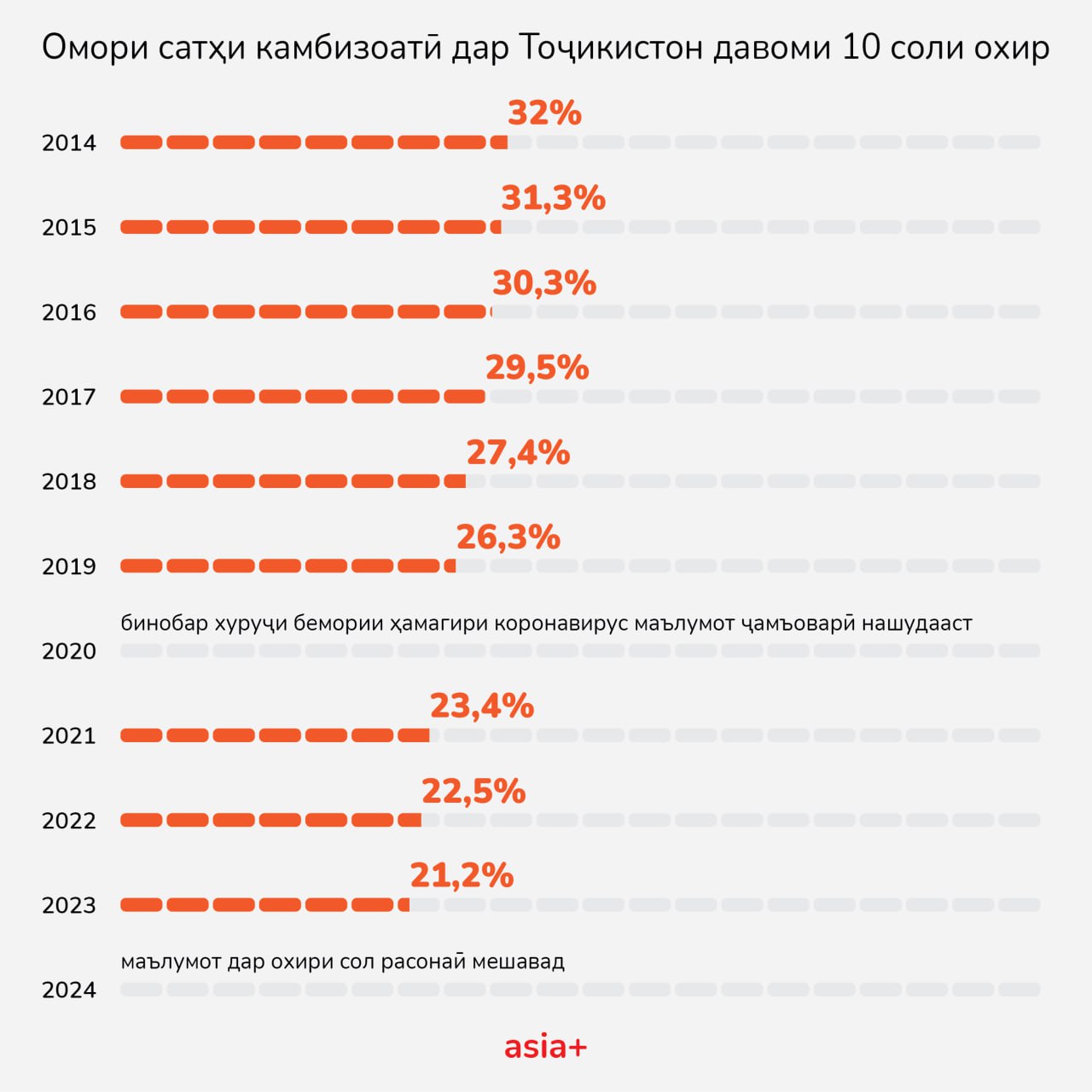 То 42% ҳамчун синфи миёна ҳисоб шудани аҳолии Тоҷикистон дар ҳолест, ки аксар аз бекориву нодорӣ ва даромади даркорӣ надоштан шикоят мекунанд. Ҳамчунин, ҳисаи камбизоатӣ дар кишвар 21% гуфта мешавад.