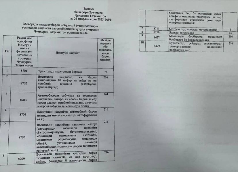 Дар он ба таври мушаххас намуди воситаҳои нақлиёт ва ҳаҷми пардохт бо нишондиҳанда барои ҳисобҳо бо ишора “меъёрҳои пардохт барои нобудсозӣ (утилизатсия)-и воситаҳои нақлиёти автомобилии ба ҳудуди гумрукии Ҷумҳурии Тоҷикистон воридшаванда” дарҷ шудааст.