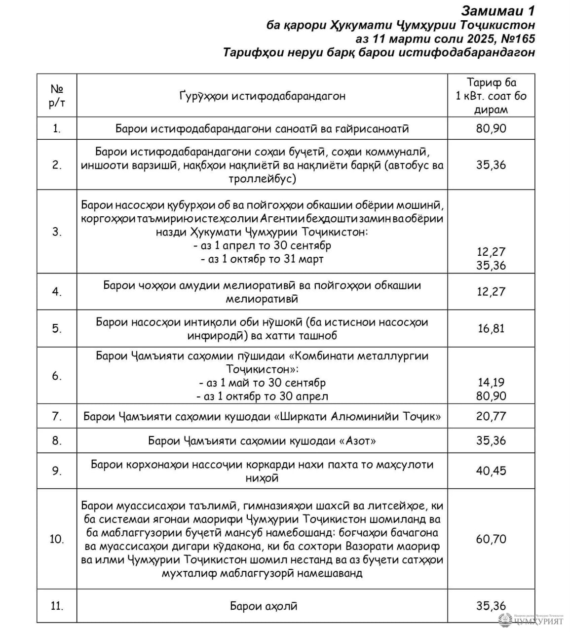 – барои “Комбинати металлургии Тоҷикистон” аз 1-уми май то 30-юми сентябр – 14,19 дирам (ҳоло 10,64 дирам аст) ва аз 1-уми октябр то 30-юми апрел – 80,90 дирам (ҳоло 60,65 дирам аст);