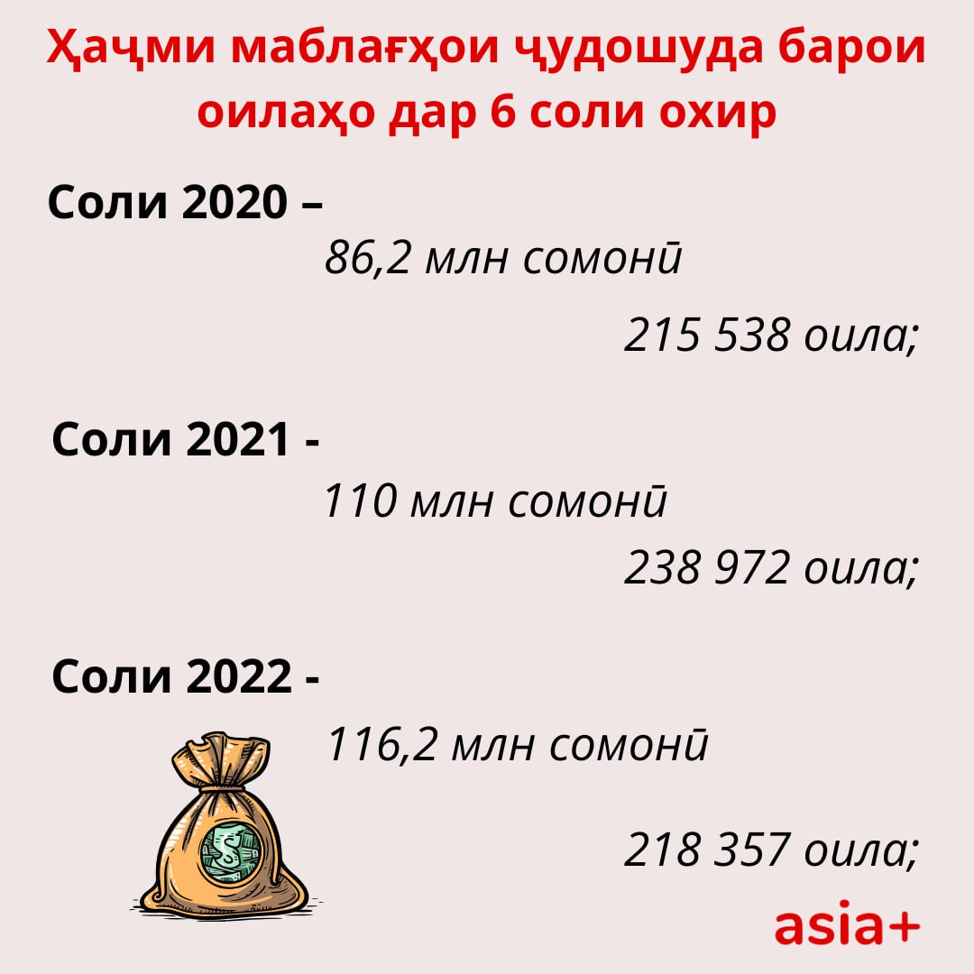Ҳаҷми кӯмакпулии иҷтимоӣ, ки дар 6 соли охир барои оилаҳои камбизоат ҷудо карда шуд.