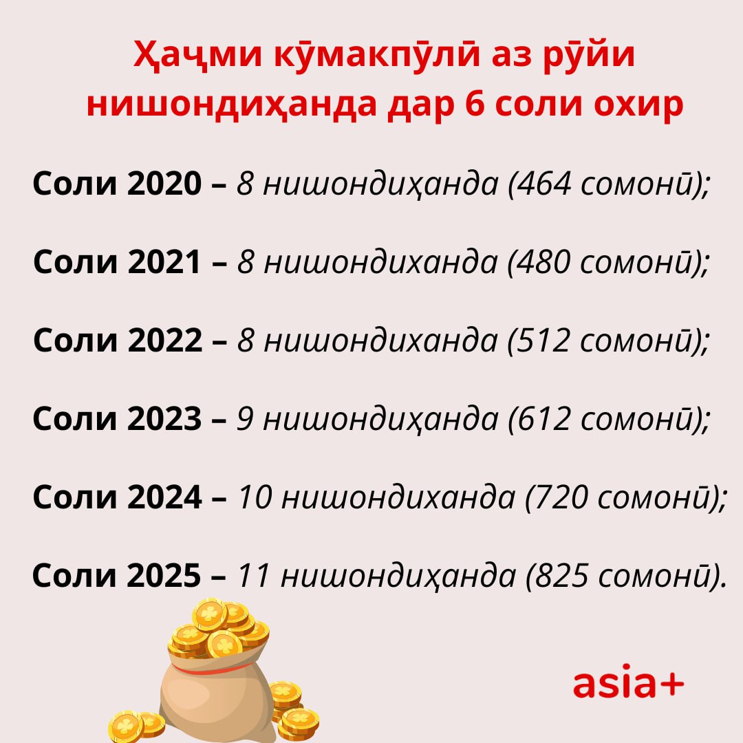 Бояд гуфт, илова ба 825 сомоние, ки дар 12 моҳ пардохт мешавад, агар оилаи камбизоат 1 кӯдаки то 16-сола дошта бошад, ду ва зиёда маъюб ва ё пиронсоли аз 80-сола боло дошта бошад, 150 сомонӣ, яъне ду нишондиҳанда иловатан пардохта мешавад.