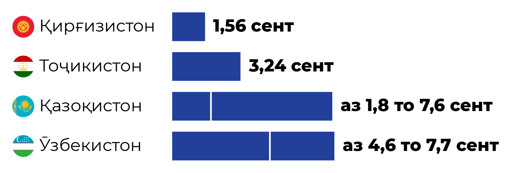 Дар Қазоқистон тарифҳои ҳадди ниҳоӣ аз 1 феврал мавриди амал қарор гирифта, дар Тоҷикистон ва Ӯзбекистон – аз 1 апрел ва Қирғизистон – аз 1 май дар назар аст. Дар бораи арзиши барқ дар Туркманистон маълумот дастрас нест.