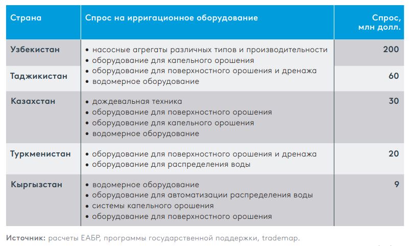 Аз ҷумла, ба афзоиши талабот ба ҳалли муосири обёрӣ таваҷҷуҳ зоҳир мешавад. Пешбинӣ мешавад, ки то соли 2040 масоҳати заминҳои обёришаванда дар минтақа ба 10,6 млн гектар мерасад. Ин боиси афзоиши ниёз ба технологияҳои пешрафтаи обёрӣ шуда, имкониятҳои истеҳсоли маҳаллии таҷҳизоти обёриро бо арзиши то 426 млн доллар дар як сол фароҳам месозад.