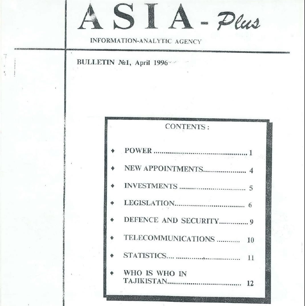 Аввалин варақаи иттилоотӣ – таҳлилии “Азия-Плюс” рӯзи сешанбе, 2-юми апрели соли 1996 нашр гардид, ҳарчанд он ду-се рӯз пеш омода шуда буд. Аммо чун 31-уми март рӯзи истироҳат ва рӯзи душанбе 1-уми апрел буд, мо аз нашри варақа дар рӯзи душанбе худдорӣ кардем, зеро нахостем, ки онро ҳамчун шӯхии 1-уми апрелӣ пиндоранд.