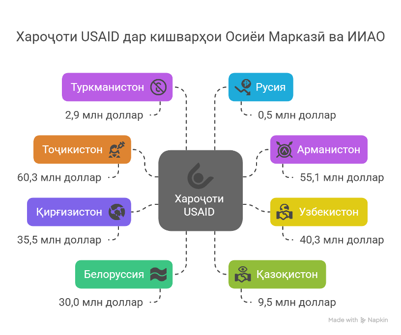 Миёни кишварҳои минтақаи Осиёи Марказӣ ва Иттиҳоди иқтисодии АвруОсиё (ИИАО ё худ ЕАЭС) Тоҷикистон аз ҳама зиёдтар аз USAID кумак гирифта, Арманистон дар зинаи дуюм қарор дорад. Ба Ӯзбекистону Қирғизистон ва Беларус низ маблағҳои назаррас ирсол шудааст. Ба Қазоқистону Туркманистон ва Русия кумак нисбатан камтар ҷудо шудааст.