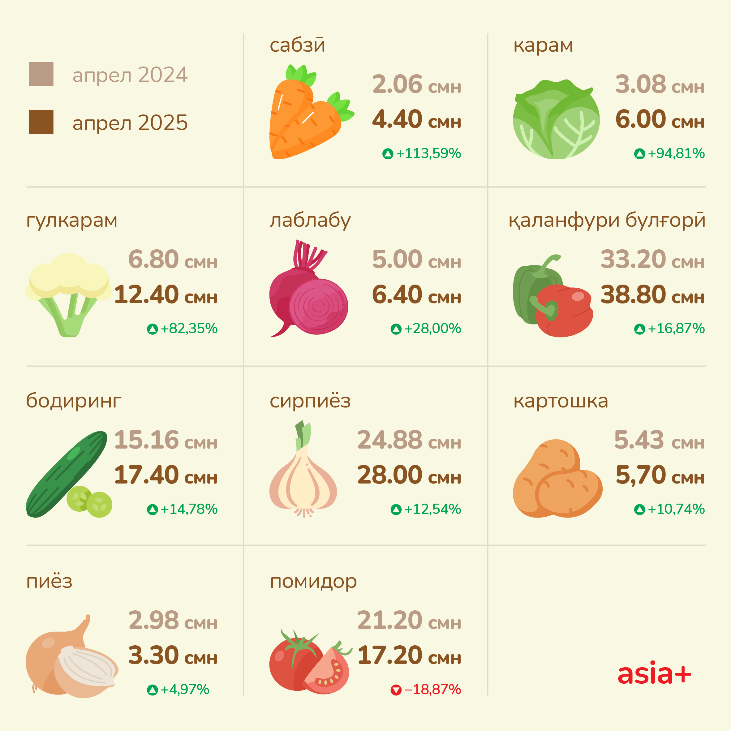 Моҳи апрели соли 2025 нархи сабзавот дар муқоиса бо ҳамин давраи соли гузашта ба таври назаррас боло рафт.
