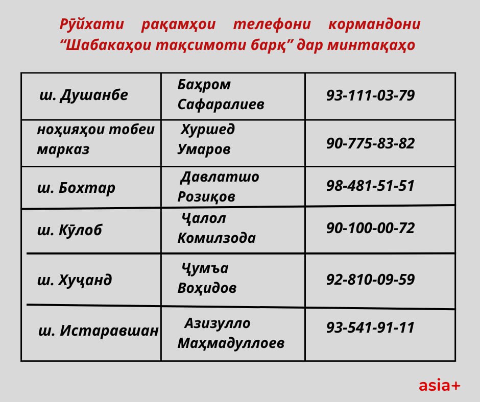 Аммо нозири барқ бояд на камтар аз 5 рӯз пеш аз қатъи барқ сокинонро огоҳ намояд ва рӯзу соати қатъкуниро бо онҳо мувофиқа кунад.