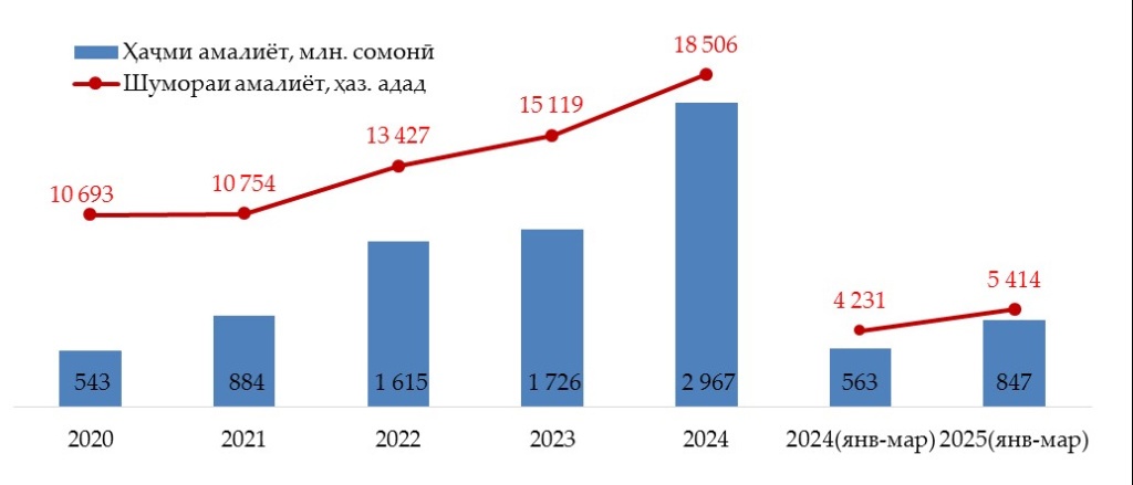 Маблағи ин амалиёт дар ин давра қариб 5,5 баробар – аз 543 млн сомонӣ дар соли 2020 то 2 млрд 967 млн сомонӣ дар соли 2024 зиёд шудааст.