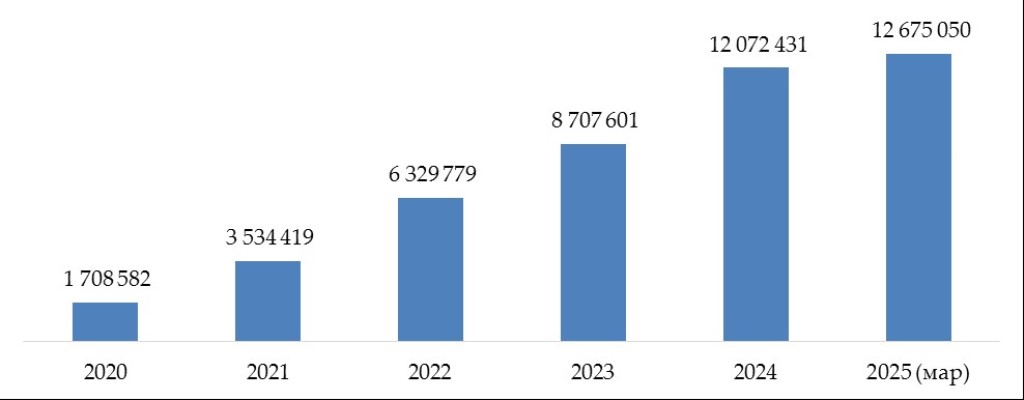 Бино ба маълумоти БМТ, шумори умумии ҳамёнҳои электронии ташкилотҳои қарзӣ то охири моҳи марти соли ҷорӣ ҳудуди 12,7 млн ададро ташкил додааст, ки 32,8% зиёдтар нисбат ба ҳамин давраи соли 2024 аст.