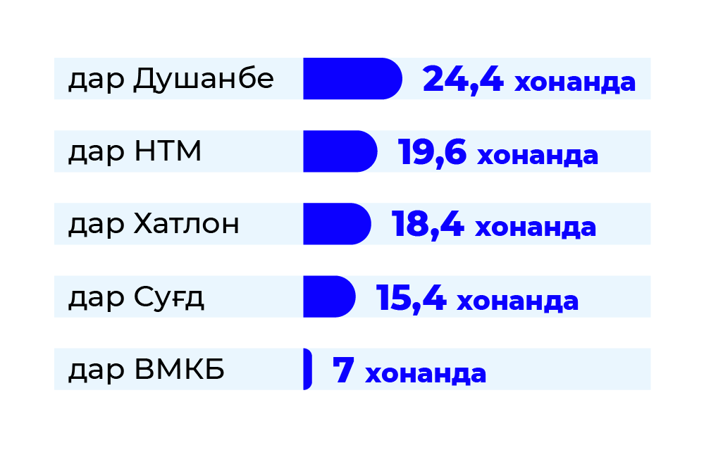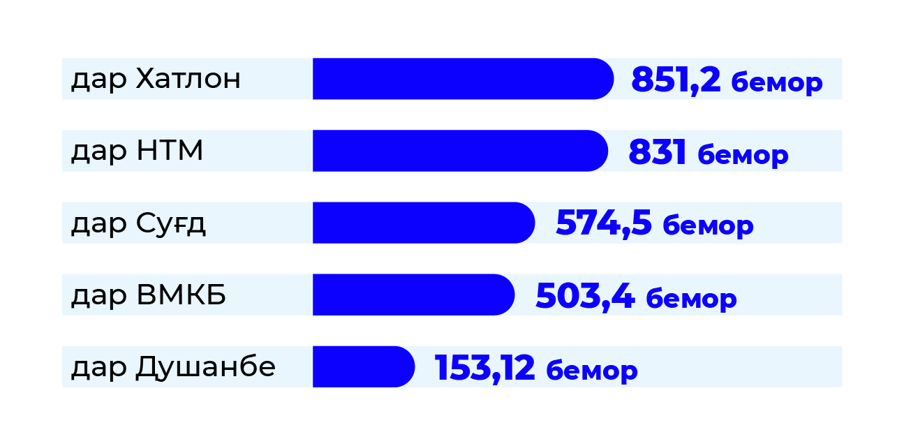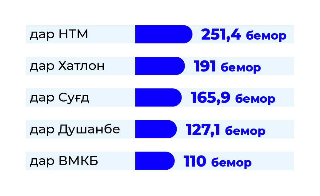 Дар Душанбе вазъ беҳтар аст. Ин ҷо ба 161,6 нафар 1 кат рост меояд, ки аз сатҳи бештар баланди дастрасӣ ба хидматрасонии тиббӣ гувоҳӣ медиҳад. Дар шаҳру ноҳияҳои тобеи марказ ба 1 кат 364,1 нафар, Суғд – 187,1 нафар, Хатлон – 321,3 нафар ва ВМКБ – 115,7 нафар рост меояд.