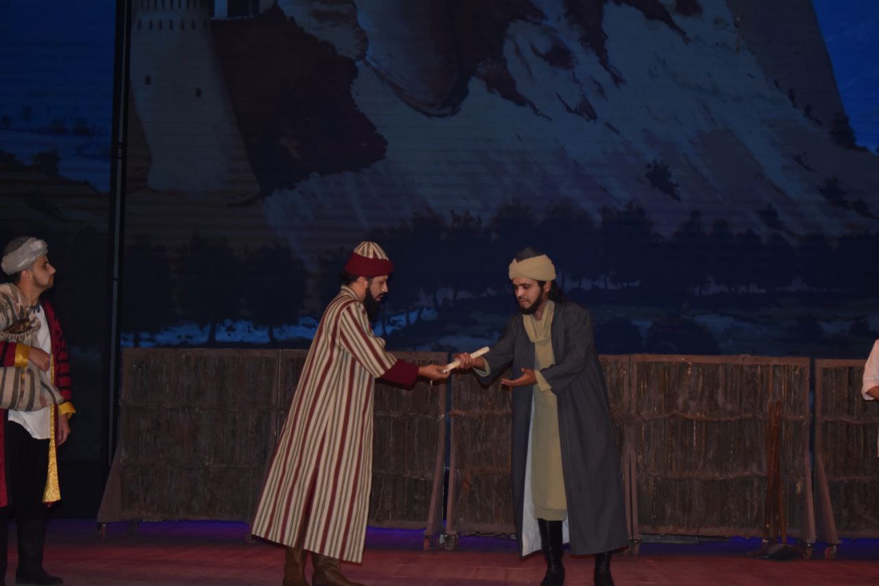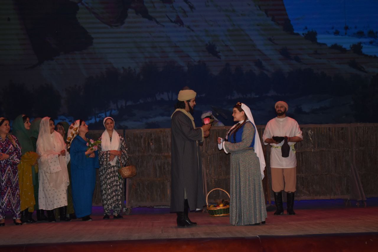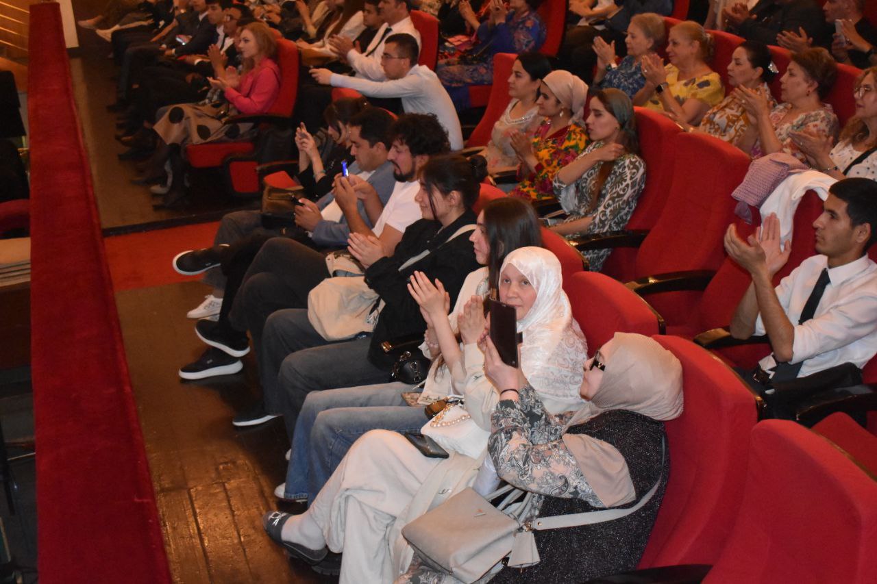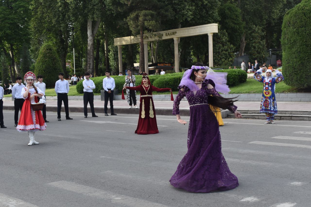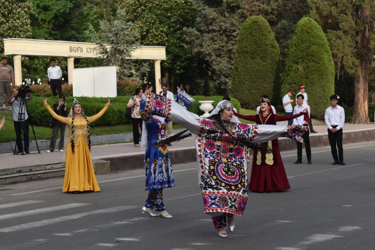 Дар саҳни театр, нахуст, зери оҳангҳои гуногун, рақсҳои миллии тоҷикон, туркҳову озариҳо, қазоқҳову ӯзбекҳо ва русҳо намоиш дода шуд. Ин қисмати фароғатиро меҳмонон хуш истиқбол карданд.