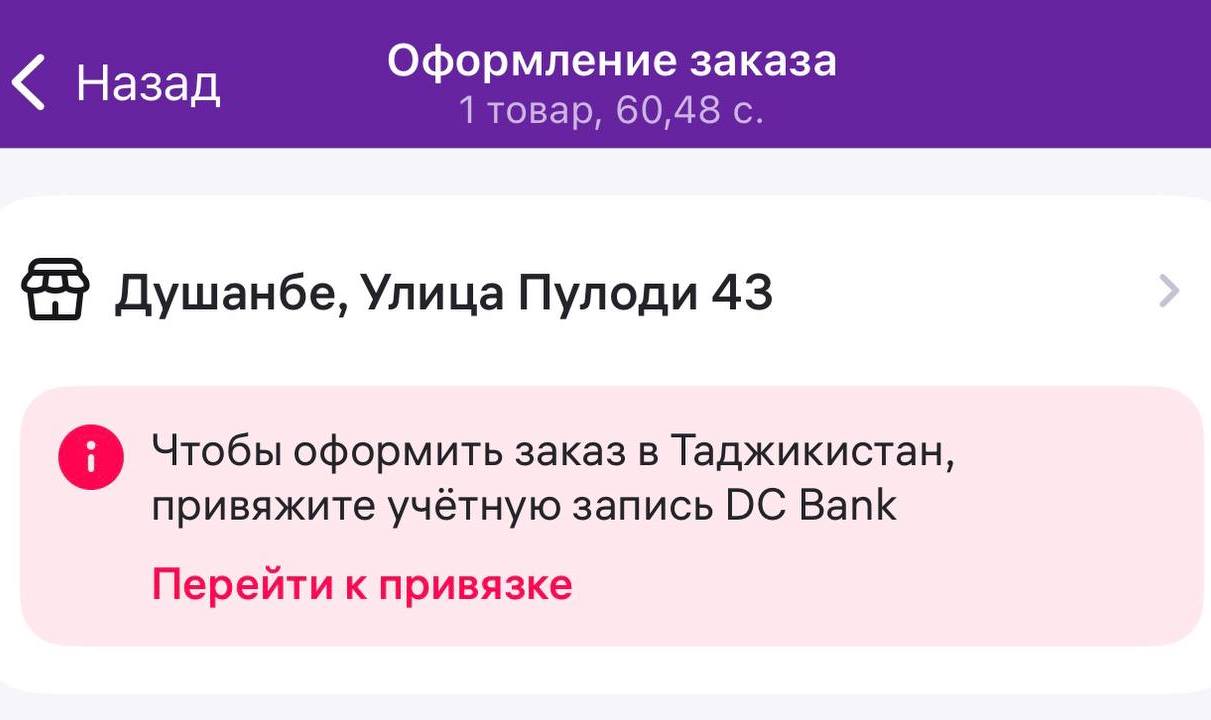 Барои аз Тоҷикистон фармоиш додан, шумо бояд дар “Dushanbe City Bank” ҳисоби фаъол дошта бошед. Яъне, барномаи мобилии “DC Next” бояд дар телефони шумо фаъол ва ба “Wildberries” пайваст карда шавад.