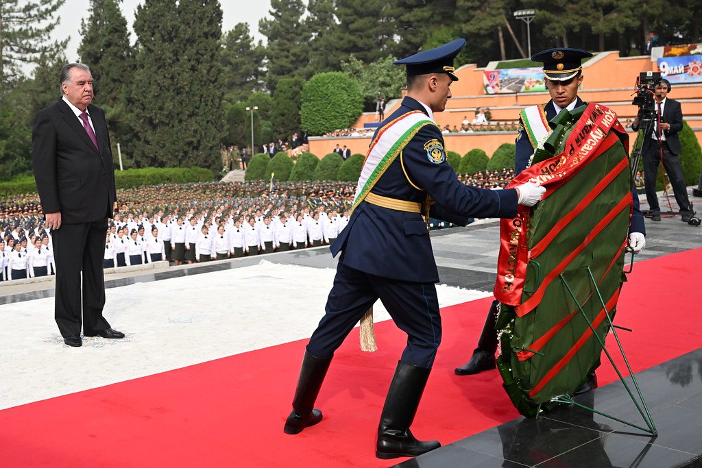 Сардори давлат дар идома барои пос доштани хотираи афсарону сарбозон ва онҳое, ки ҷони худро дар Ҷанги Бузурги Ватанӣ нисор кардаанд, дар назди “Оташи ҷовидон” гулчанбар гузошт ва дар гузашти низомӣ ширкат кард.