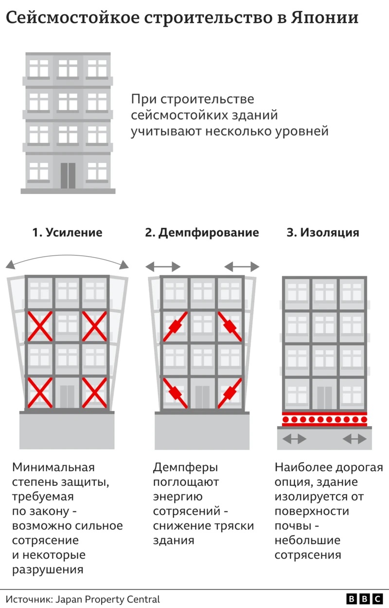 Ҷопон бо назардошти фаъол будани минтақаи сейсмикӣ, яке аз аввалин кишварҳоест, ки масъалаи аз лиҳози сейсмикӣ устувор будани биноҳоро ҷиддӣ пайгирӣ кард. Дар он ҷо биноҳоро чунин месозанд: