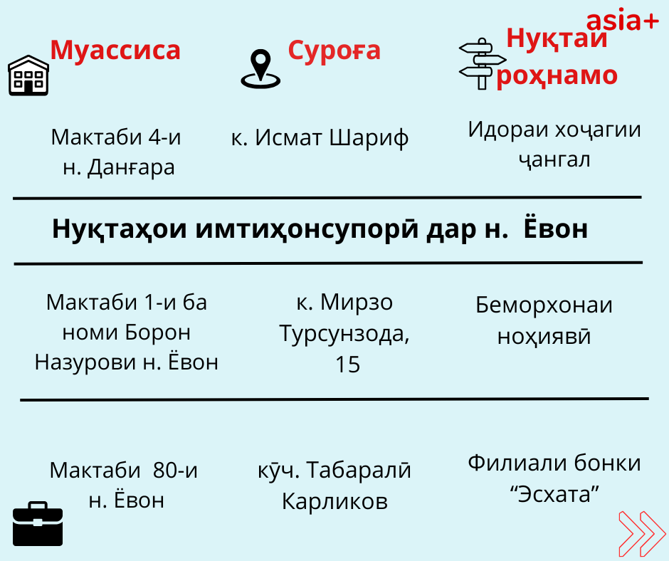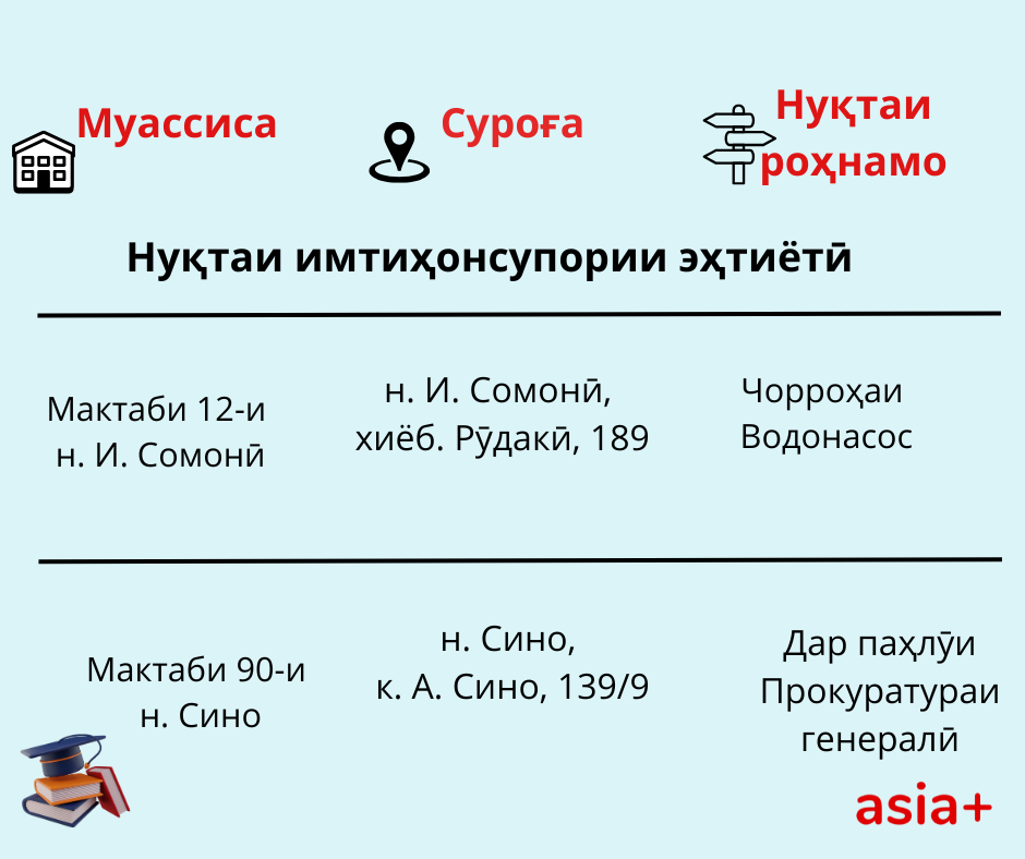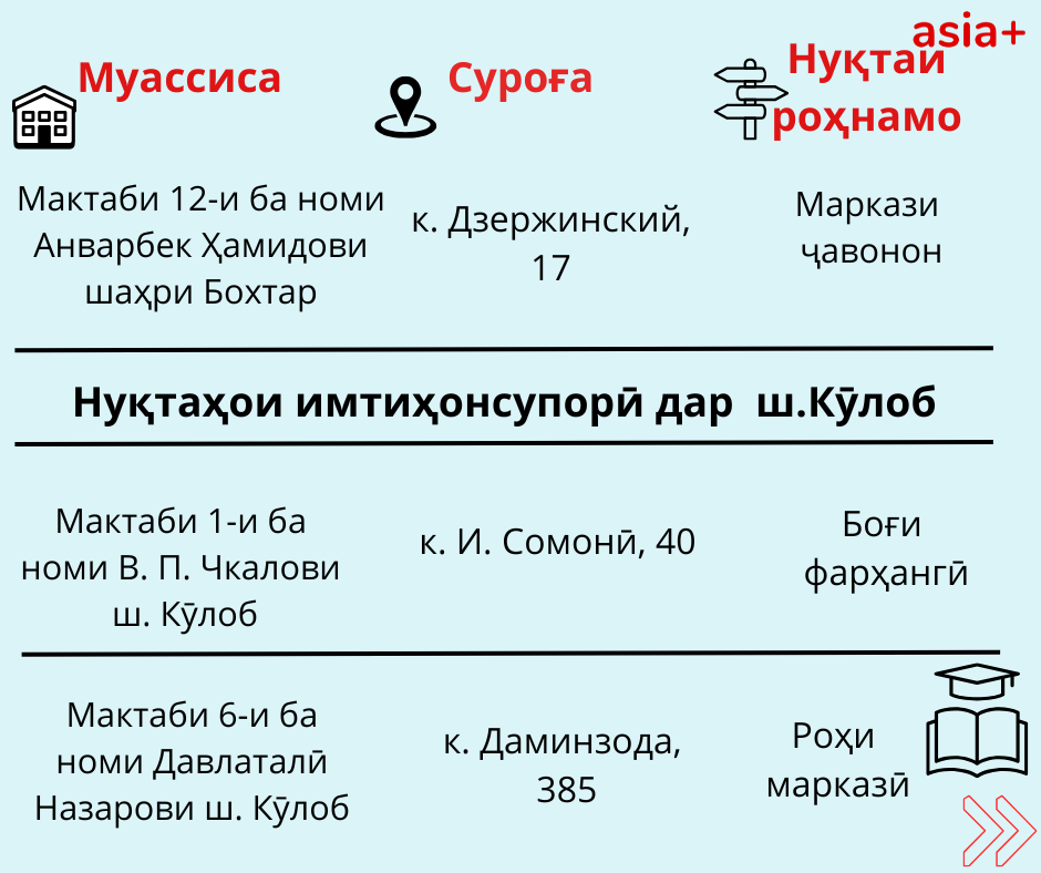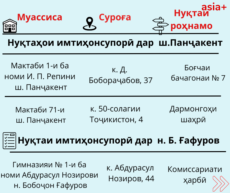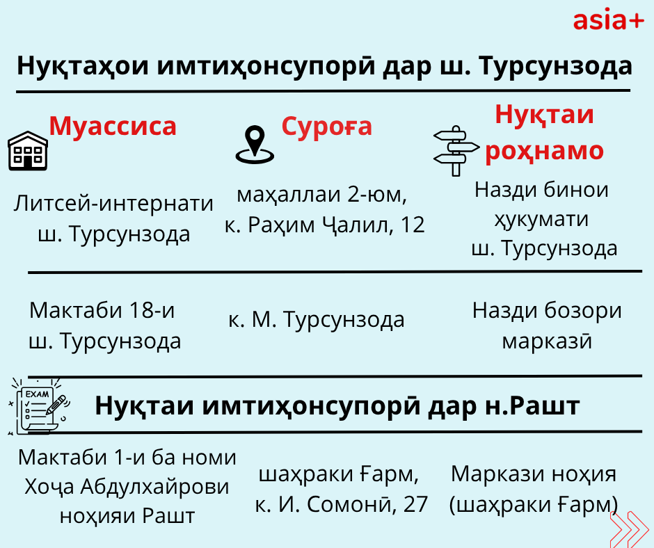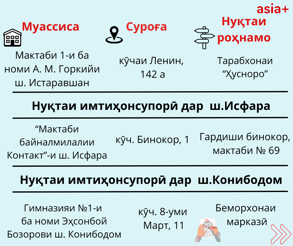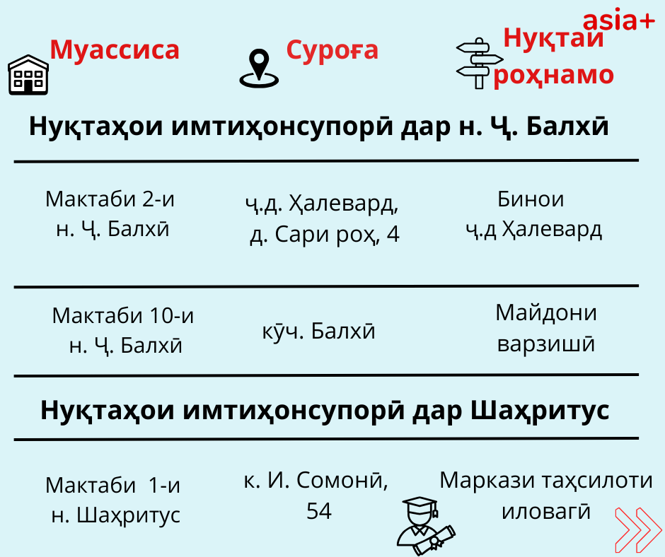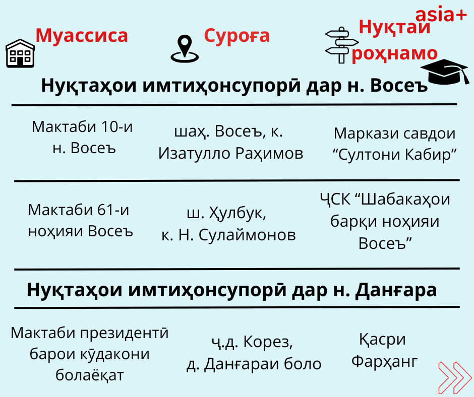 Нуқтаҳои имтиҳонсупории ҳар шаҳру навоҳии кишварро дар тасвирбаёни мо бубинед: