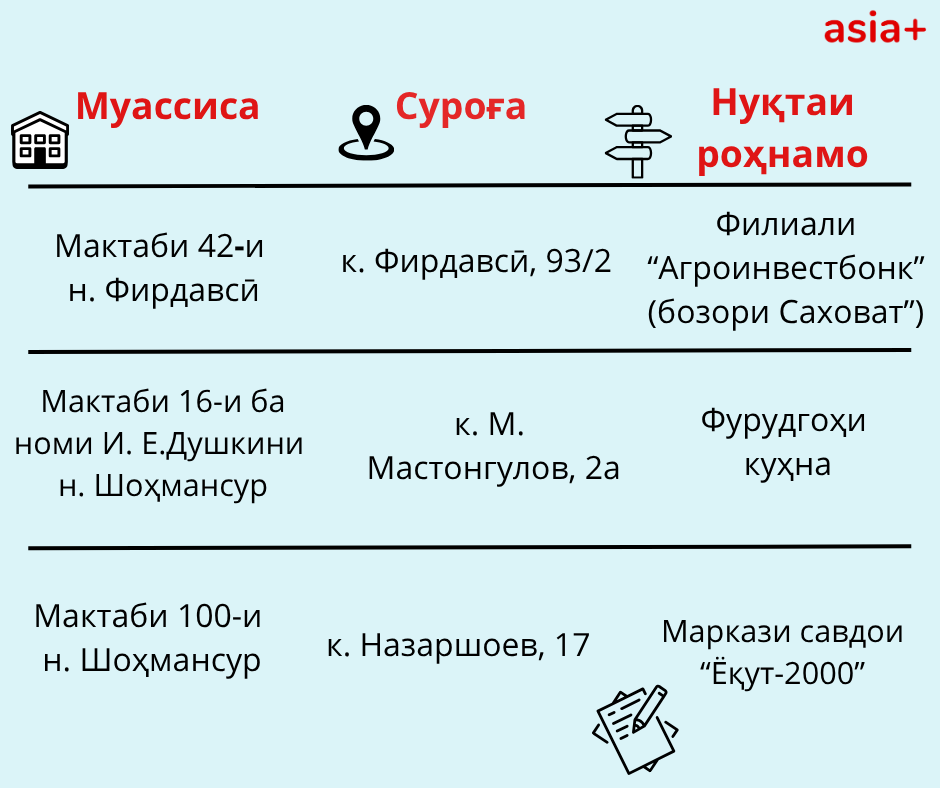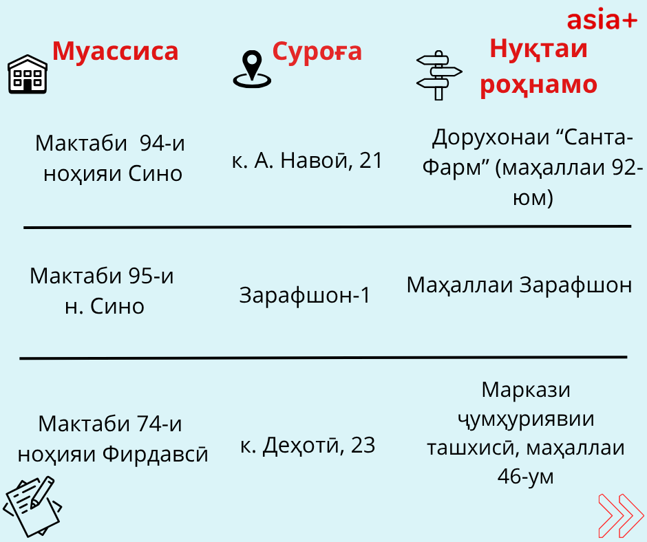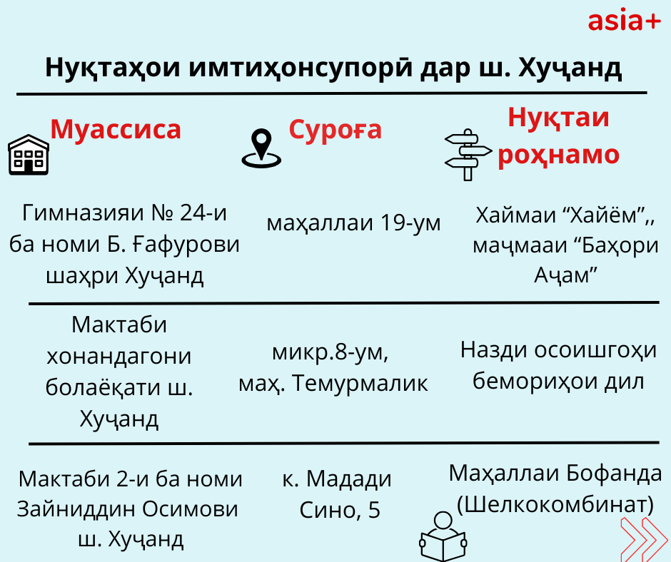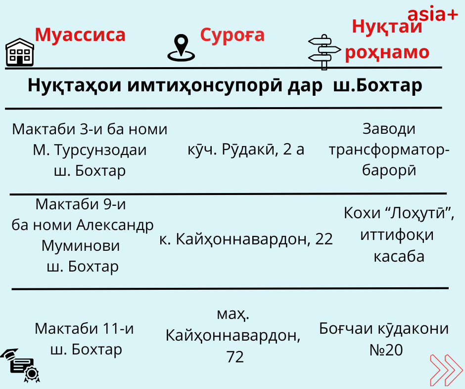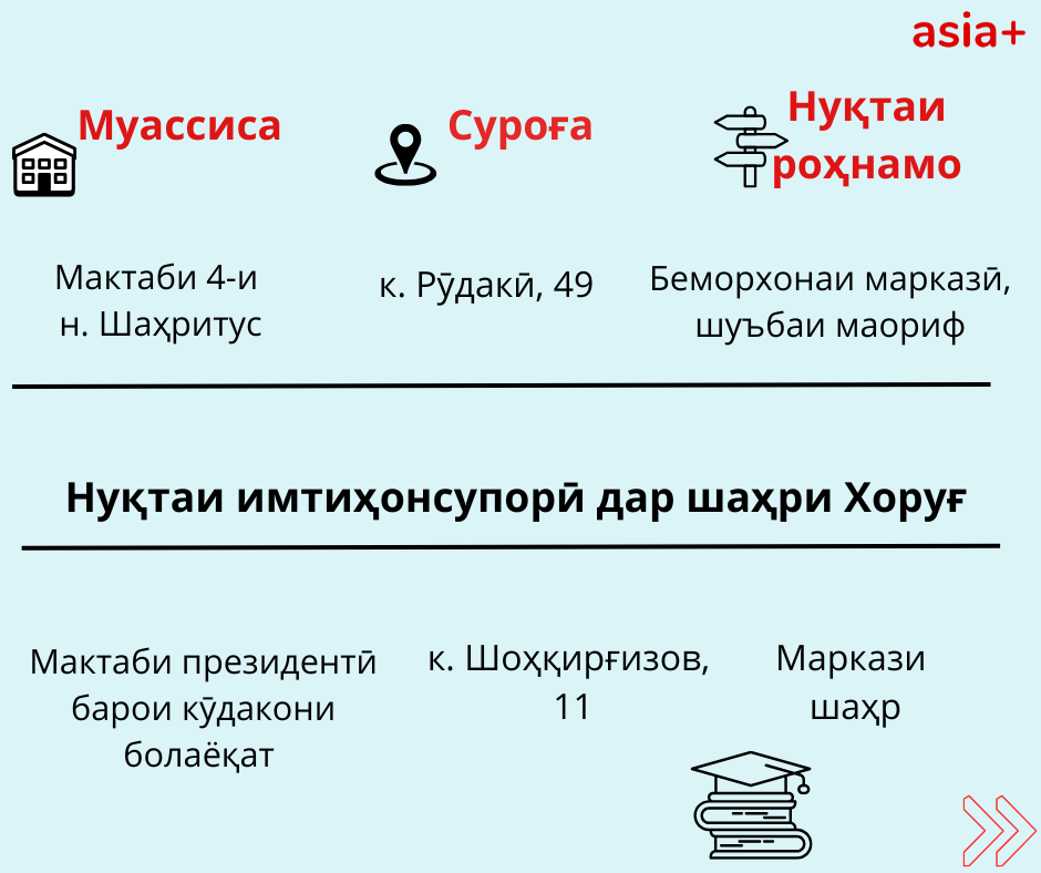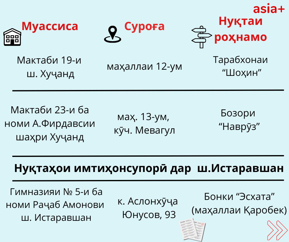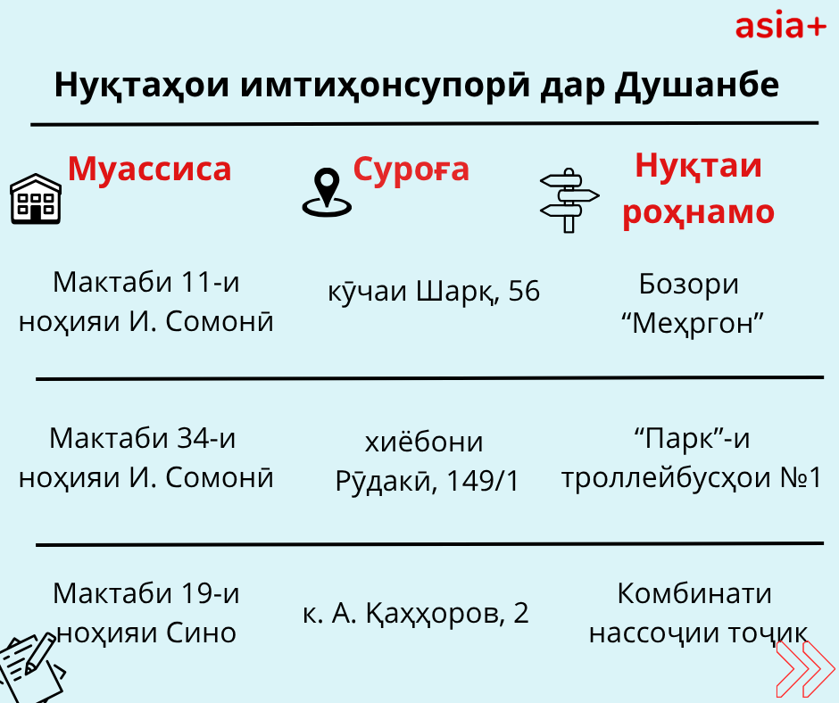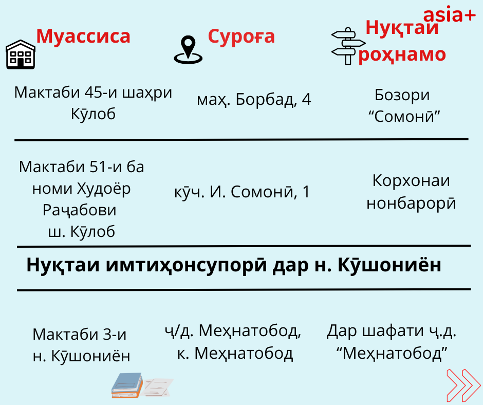 Нуқтаҳои имтиҳонсупории ҳар шаҳру навоҳии кишварро дар тасвирбаёни мо бубинед: