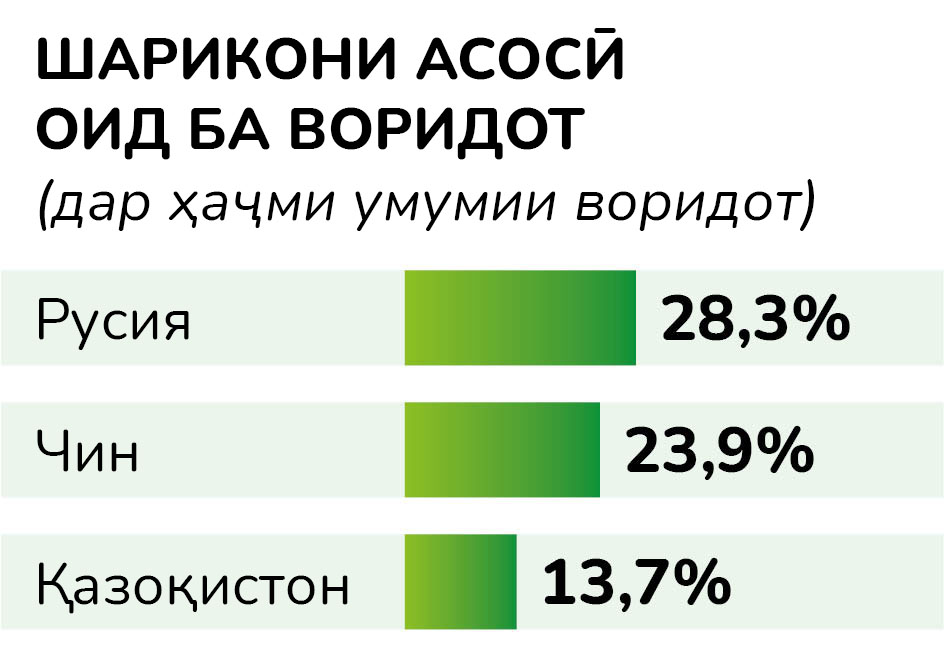 Ба ин тариқ, қариб чор баробар зиёд будани воридот нисбат ба содирот аз тавозунҳои манфии ҷиддии сохторӣ дар иқтисоди Тоҷикистон дарак медиҳад.