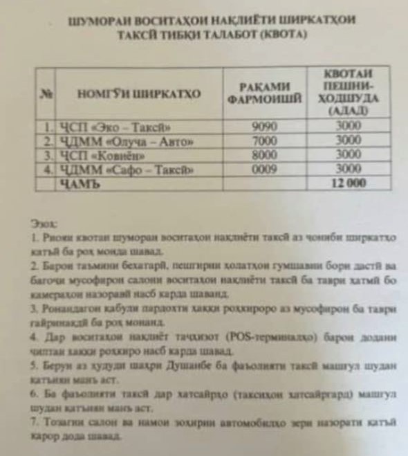 Ҳамчунин, дастур шудааст, ки кирокашҳои ин ширкатҳо берун аз ҳудуди шаҳри Душанбе ба фаъолияти мусофиркашонӣ машғул нашаванд.
