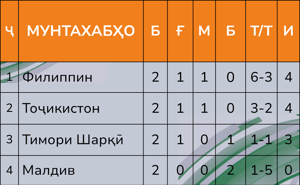 Ҳамин тавр, ҳисоби бозӣ то охири дидор дигар тағйир наёфт ва дастаҳо 2:2 мусовӣ карданд. Баъди ин мусовӣ ҳарду даста соҳиби 4 имтиёзӣ шуда, Филиппин аз рӯи таносуби беҳтари голҳо дар ҷои аввал ва Тоҷикистон дар мавқеи дуюми ҷадвали гурӯҳи “А” қарор гирифт.