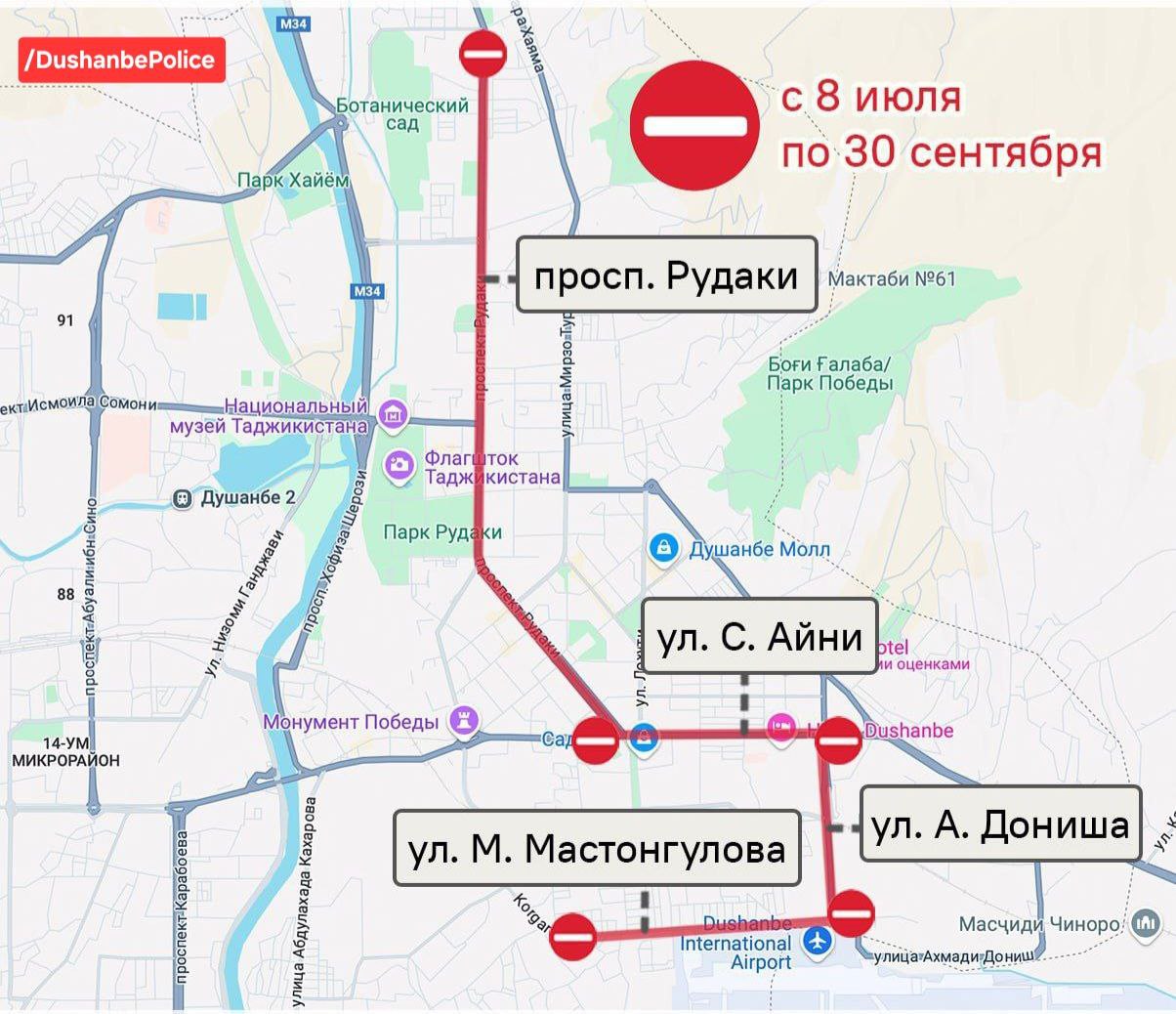 Ҳаракати тамоми намуди нақлиёт тавассути се кӯчаи асосии шаҳри Душанбе- – кӯчаҳои А. Дониш, С. Айнӣ ва хиёбони Рӯдакӣ (аз Фурудгоҳи байналмилалии Душанбе то кӯчаи Карамов) ҳудуди се моҳ – то 30-юми сентябр, марҳила ба марҳила қатъ мегардад.