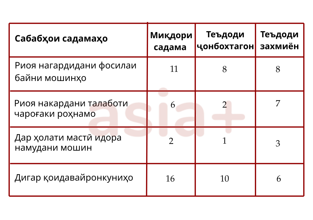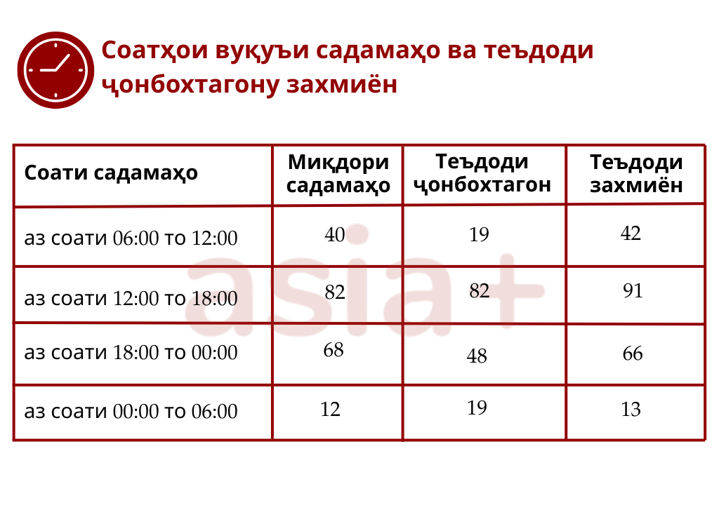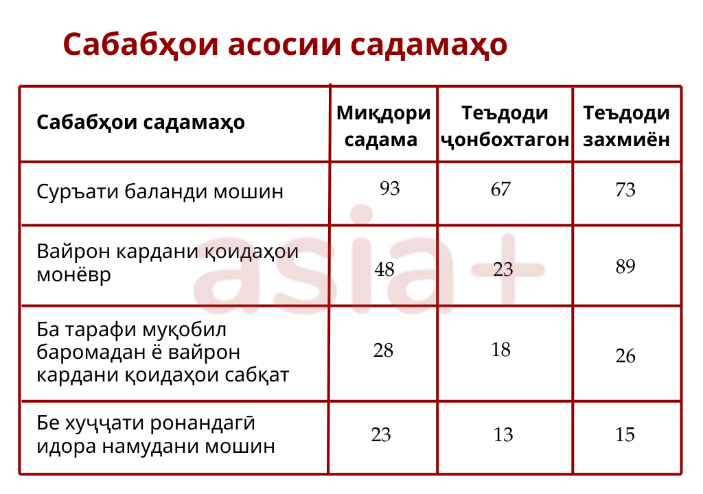 Ҳамзамон, ин ниҳод омор ва сабабу омилҳои рух додани садама, синну соли ҳалокшудагон ва вақту соатҳои садамаҳоро нашр кардааст.
