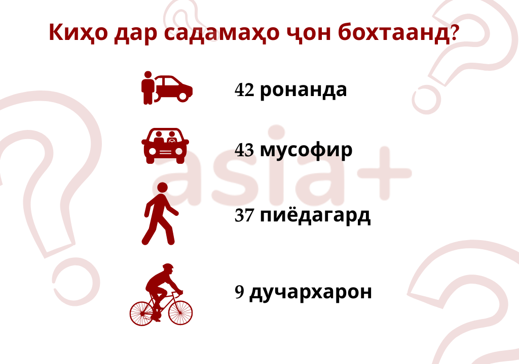 Бояд зикр кард, ки ҳар сол дар пайи садамаҳои нақлиётӣ дар кишвар садҳо нафар ҳалок ва ҷароҳат мебардоранд. Аз рӯи омори расмӣ давоми соли гузашта дар кишвар 1 ҳазору 233 садамаи нақлиётӣ ба қайд гирифта шудааст. Ин дар муқоиса бо соли 2023, 122 ҳолат (соли 2023 – 1 ҳазору 111 садама) бештар будааст.