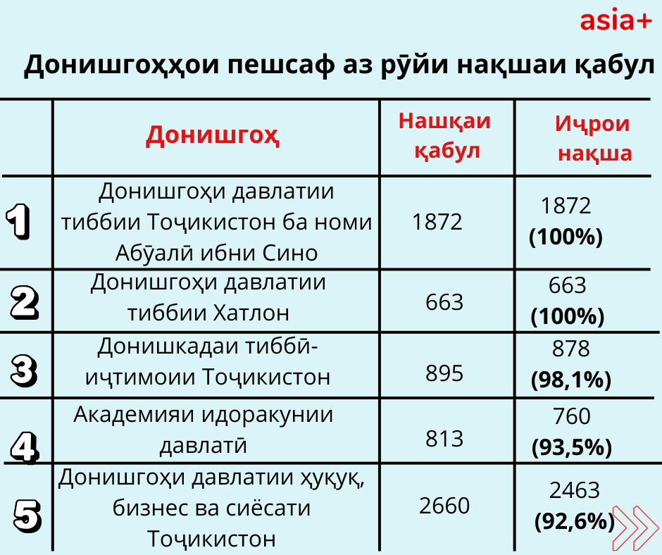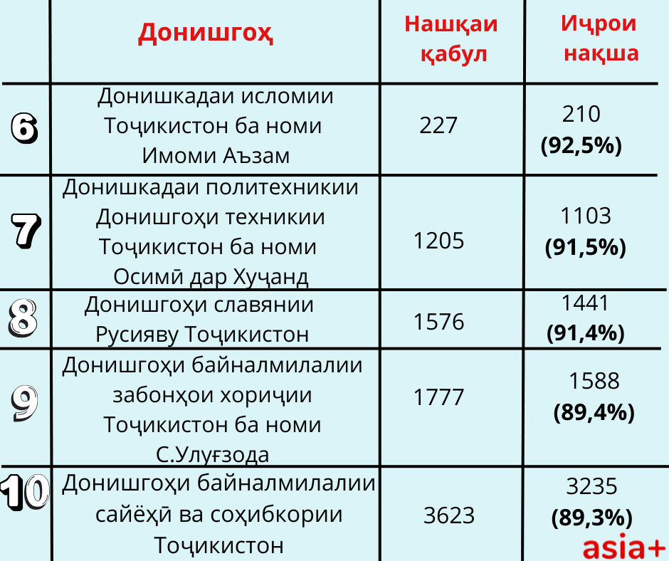 Зинаҳои охирро Донишкадаи саноат ва хизматрасонӣ бо иҷрои 22% нақшаи қабул, Донишгоҳи миллии тадқиқоти Донишкадаи эренгетикии Маскав дар шаҳри Душанбе бо иҷрои 26% ва Донишгоҳи давлатии Хоруғ бо иҷрои 29% нақшаи қабули донишҷӯён соҳиб шуданд.