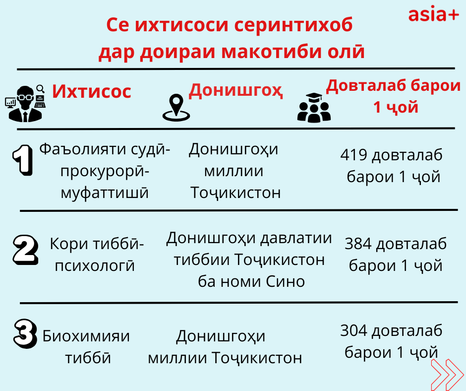 Се ихтисоси аз ҳама серинтихоб дар донишгоҳу донишкада ва коллеҷҳо инҳоянд: