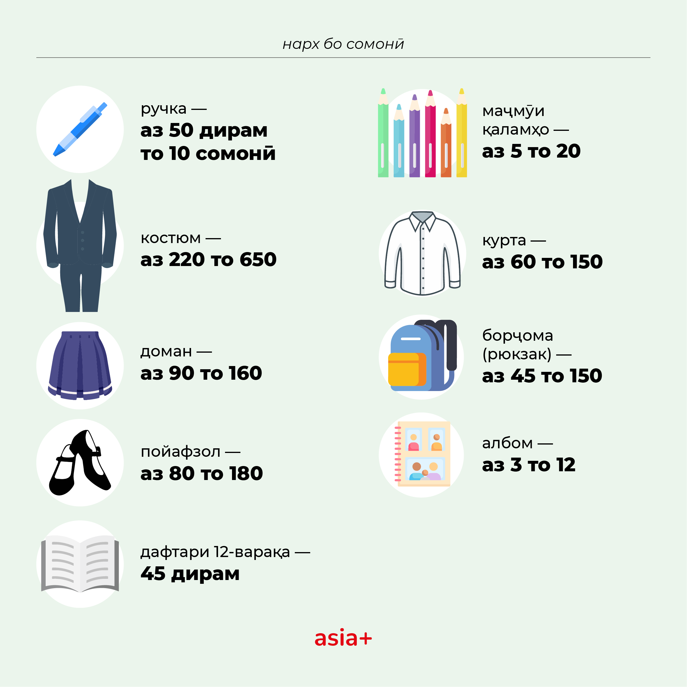 Нархи асбобу лавозимоти мактабӣ (канселярия) низ боло рафтааст. Агар соли гузашта дафтари 12-варақа ҳудуди 45 дирам нарх дошт, пас имсол арзиши он дар қариб ҳамаи мағозаҳои шаҳр 60 дирамро ташкил медиҳад.