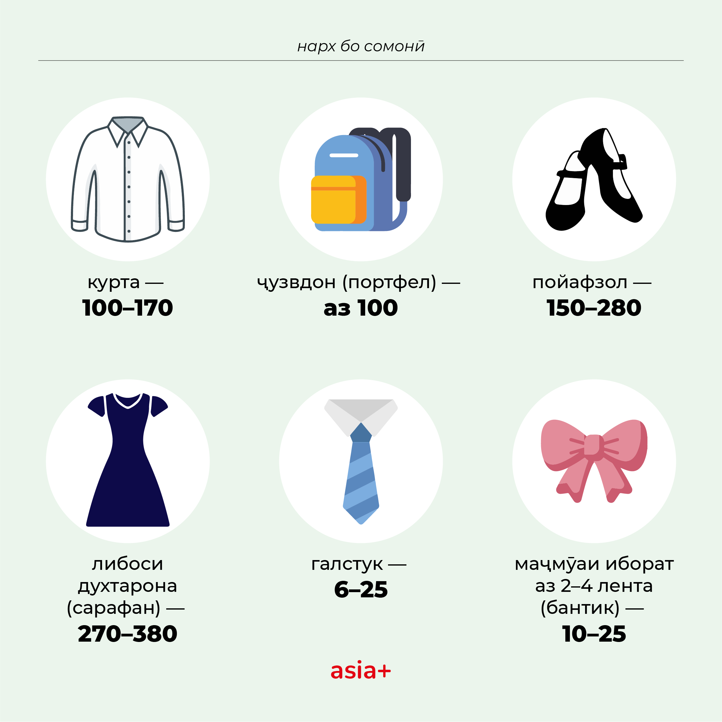 Сол то сол нархи қариб ҳама чиз, аз ҷумла сарулибоси мактабӣ дар Тоҷикистон боло меравад. "Азия-Плюс" қаблан дар бораи нархи сарулибос ва лавозимоти мактабӣ мақола навишта буд. Дар муқоиса бо соли гузашта нархҳо то чӣ андоза тағйир ёфтаанд?