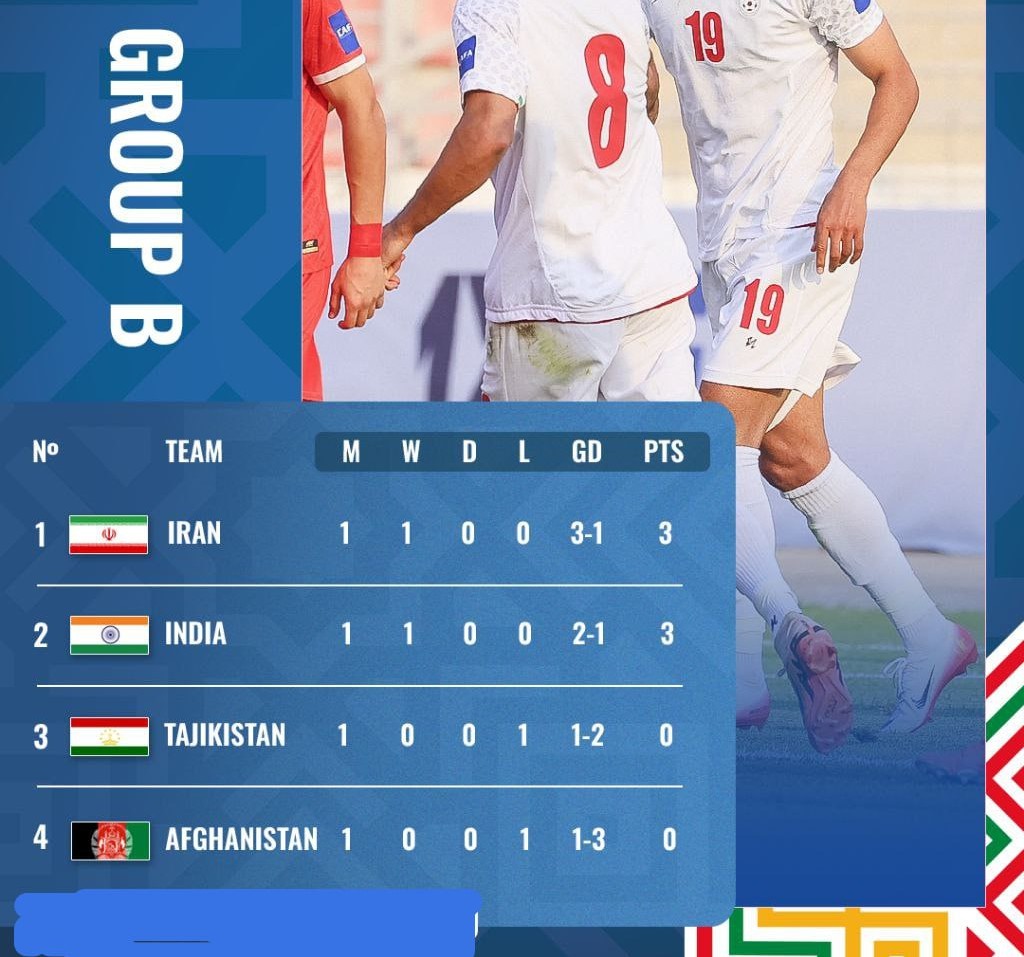 Пас аз даври аввал Эрон ва Ҳиндустон бо доштани 3 имтиёз зинаҳои якум ва дуюми гурӯҳро касб карданд. Тоҷикистону Афғонистон бошанд, бидуни хол дар зинаҳои сеюм ва чаҳорум мавқеъ гирифтанд.