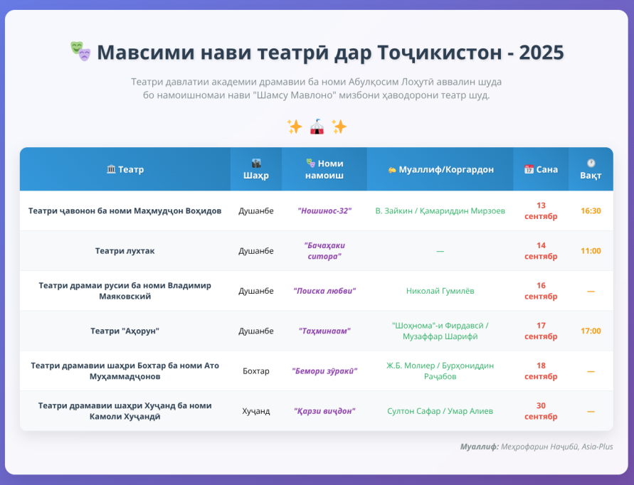 Мавсими нави театрӣ дар Тоҷикистон оғоз шуд. Аввалин шуда Театри давлатии академӣ-драмавии ба номи Абулқосим Лоҳутӣ бо намоишномаи нави “Шамсу Мавлоно” мизбони ҳаводорони театр шуд. Мо маълум кардем, ки дигар театрҳои пойтахт ва музофоти кишвар бо кадом намоиш мавсими нави театриро оғоз мекунанд.