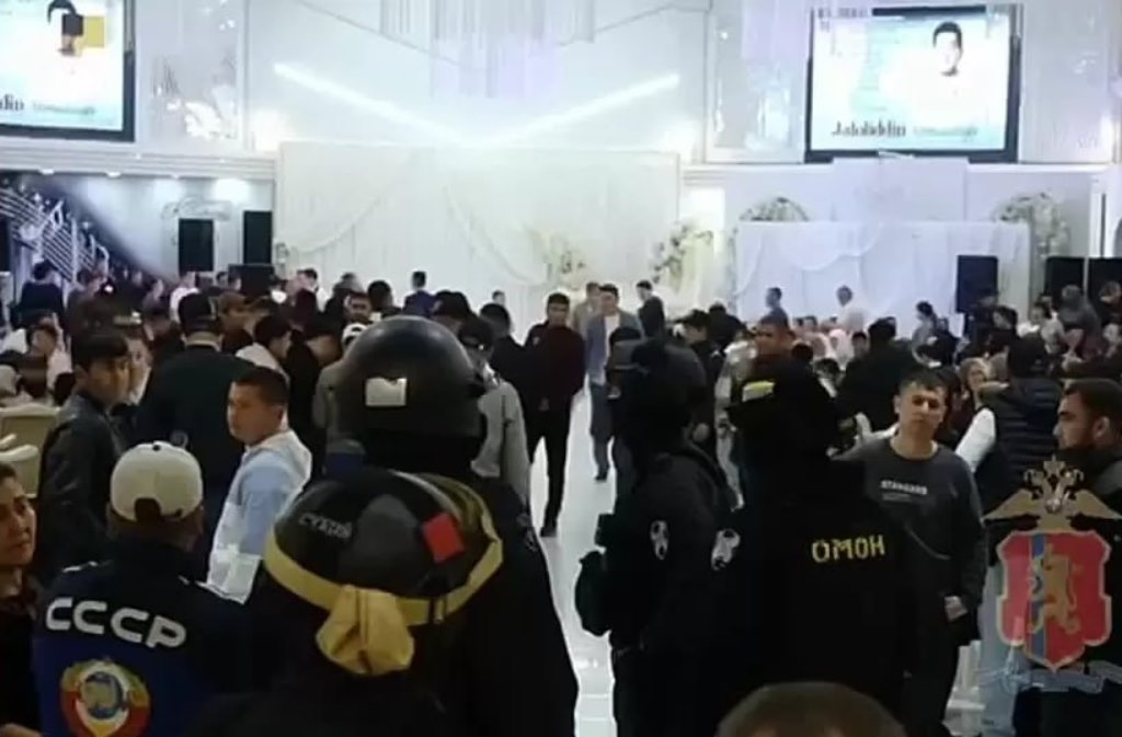Дар наворе, ки аз ҷониби ХФА-и Русия нашр шудааст, дида мешавад, ки даҳҳо корманди дастаи таъйиноти махсус ба толори тӯйхона ворид шуда, онро қатъ ва ҳуҷҷатҳои ҳамаро тафтиш мекунанд, бархеро қатор карда, дастҳояшонро бар рӯйи китфи якдигарашон гузошта, аз толор берун мебаранд.