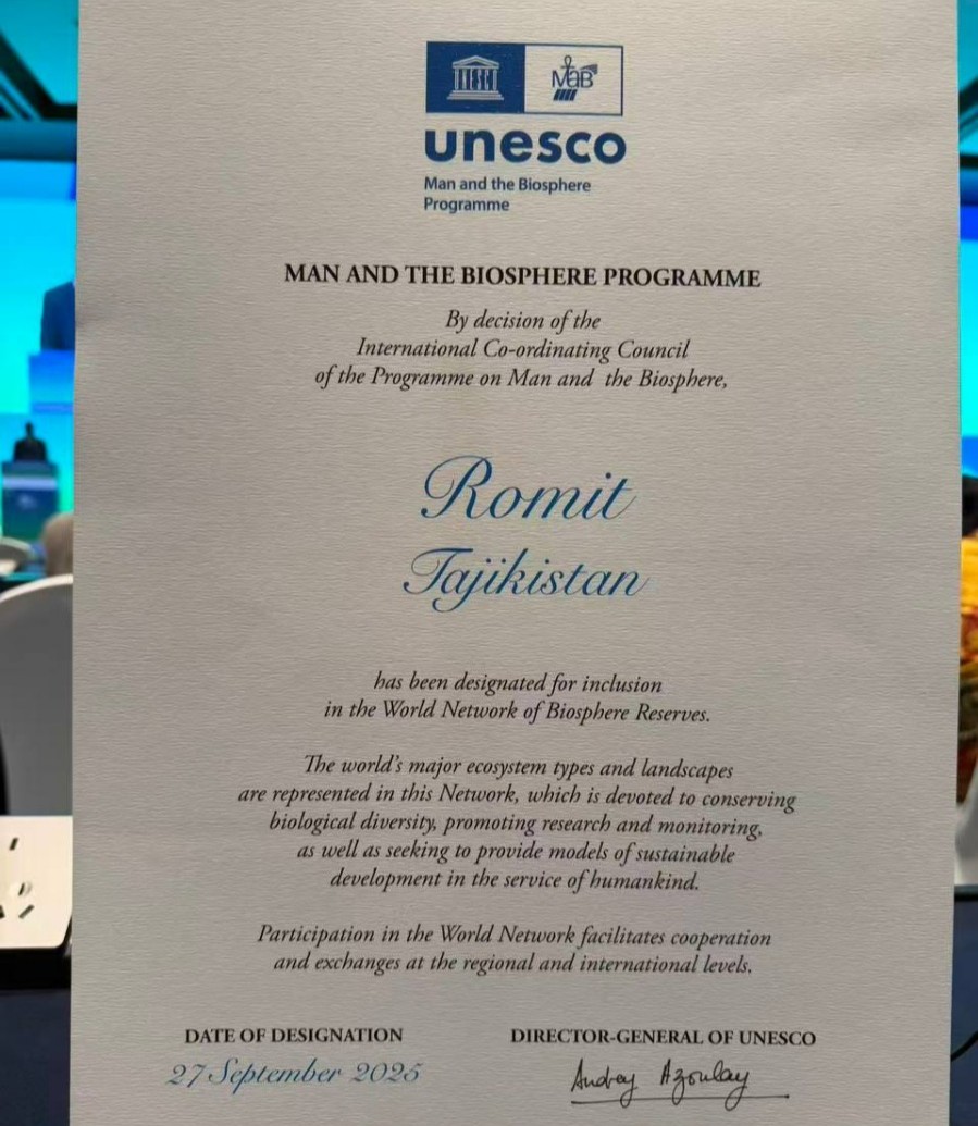 Дар ҷаласаи 37-уми Шӯрои байналмилалии ҳамоҳангсозии Барномаи “Инсон ва биосфера”, ки рӯзи 27 сентябри соли 2025 дар шаҳри Ҳанчжоуи Чин гузашт, мамнуъгоҳи биосферии “Ромит” ба Шабакаи ҷаҳонии мамнуъгоҳҳои ЮНЕСКО шомил гардид.