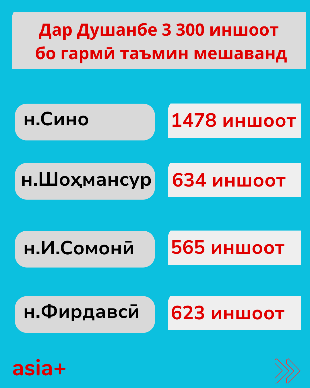 Ҳамза Ҳакимов, сармуҳандиси “Шабакаҳои гармидиҳии Душанбе” ба “Азия-Плюс” гуфт, дар ноҳияи Фирдавсӣ 79 иншоот, ноҳияи Сино 31 иншоот, ноҳияи Исмоилӣ Сомонӣ 21 иншооти нав бори аввал ба низоми гармидиҳӣ пайваст мешаванд. Дар ноҳияи Шоҳмансур бошад дар пайи тахриби биноҳо, имсол 31 иншоот кам шудааст.