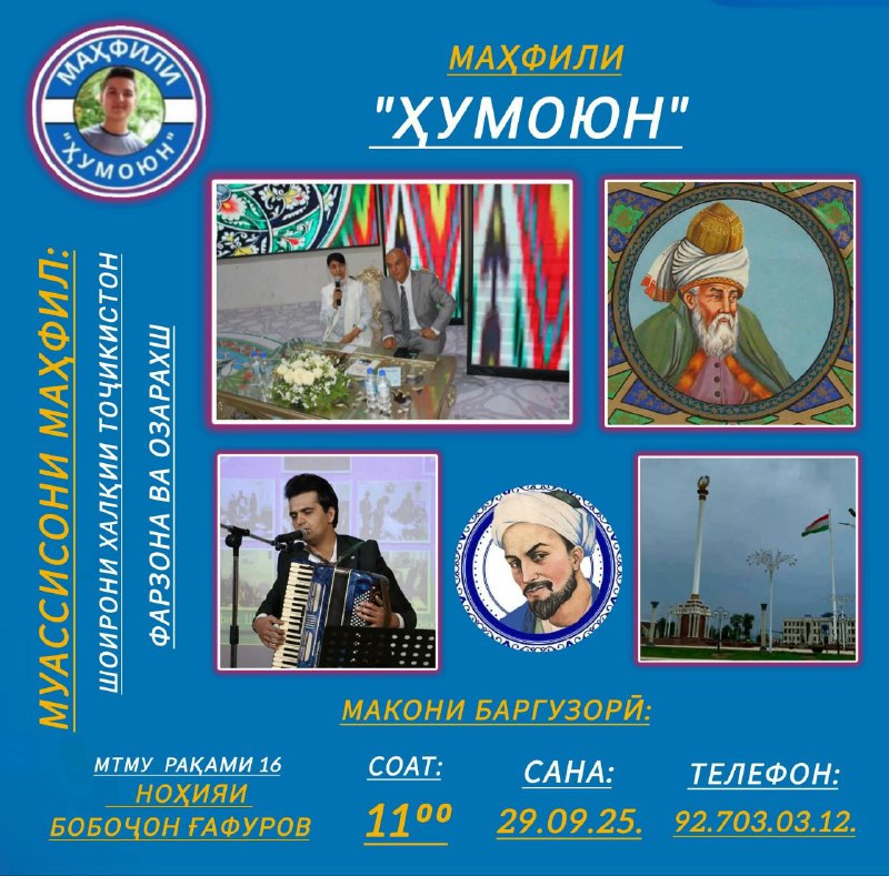 – Имрӯз соати 11:00 дар мактаби 16-и ноҳияи Бобоҷон Ғафуров маҳфили навбатии “Ҳумоюн” баргузор мегардад. Он ба Рӯзи бузургдошти Мавлоно Ҷалолуддини Балхӣ бахшида мешавад.