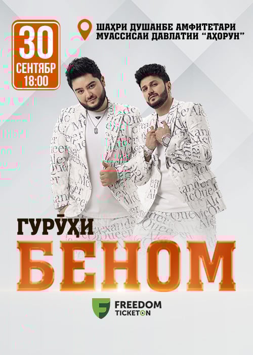 – Имрӯз соати 18:00 дар Амфитеатри “Аҳорун” дар шаҳри Душанбе шоми мусиқии гурӯҳи “Беном” баргузор мешавад. Ин гурӯҳи маъруфи Ӯзбекистон бо сурудҳои пурэҳсос ва услуби беназир, ки оҳангҳои шарқиро бо мусиқии замонавӣ омезиш медиҳад, дили миллионҳо шунавандаро тасхир кардааст. Арзиши чипта вобаста ба ҷойи нишаст аз 200 то 300 сомонӣ аст.