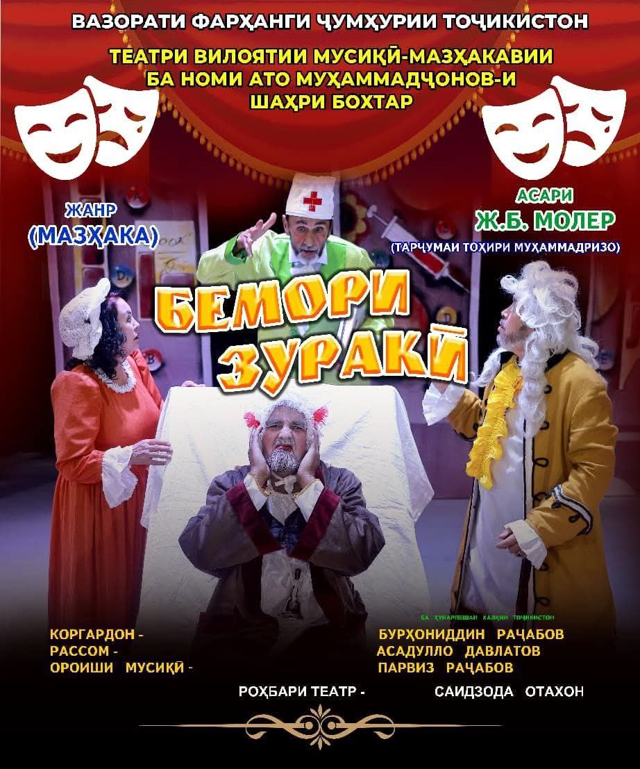 – Имрӯз, соати 17:00 дар театри вилоятии мусиқӣ-мазҳакавии ба номи Ато Муҳаммадҷонови шаҳри Бохтар намоишномаи "Бемори Зӯракӣ" манзури тамошобинон мегардад. Ин намоишнома бо коргардонии Бурҳониддин Раҷабов ба саҳна омадааст.
