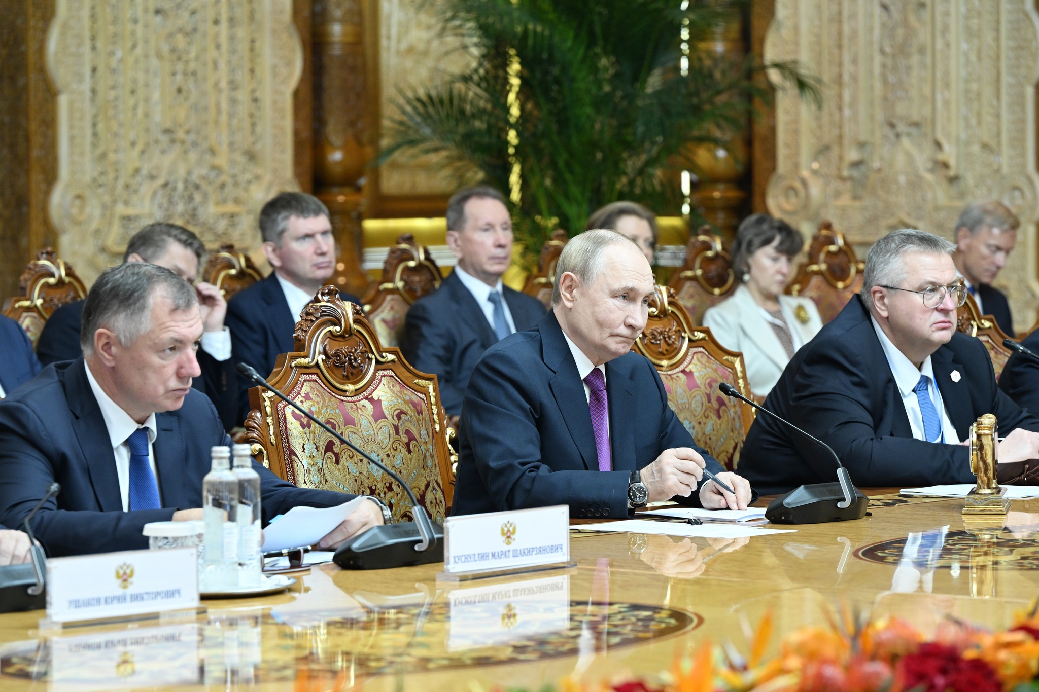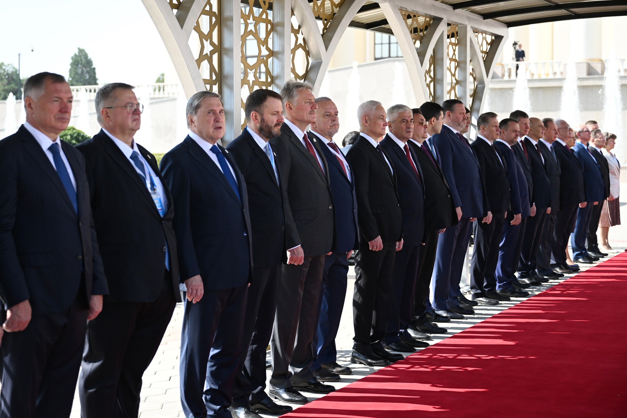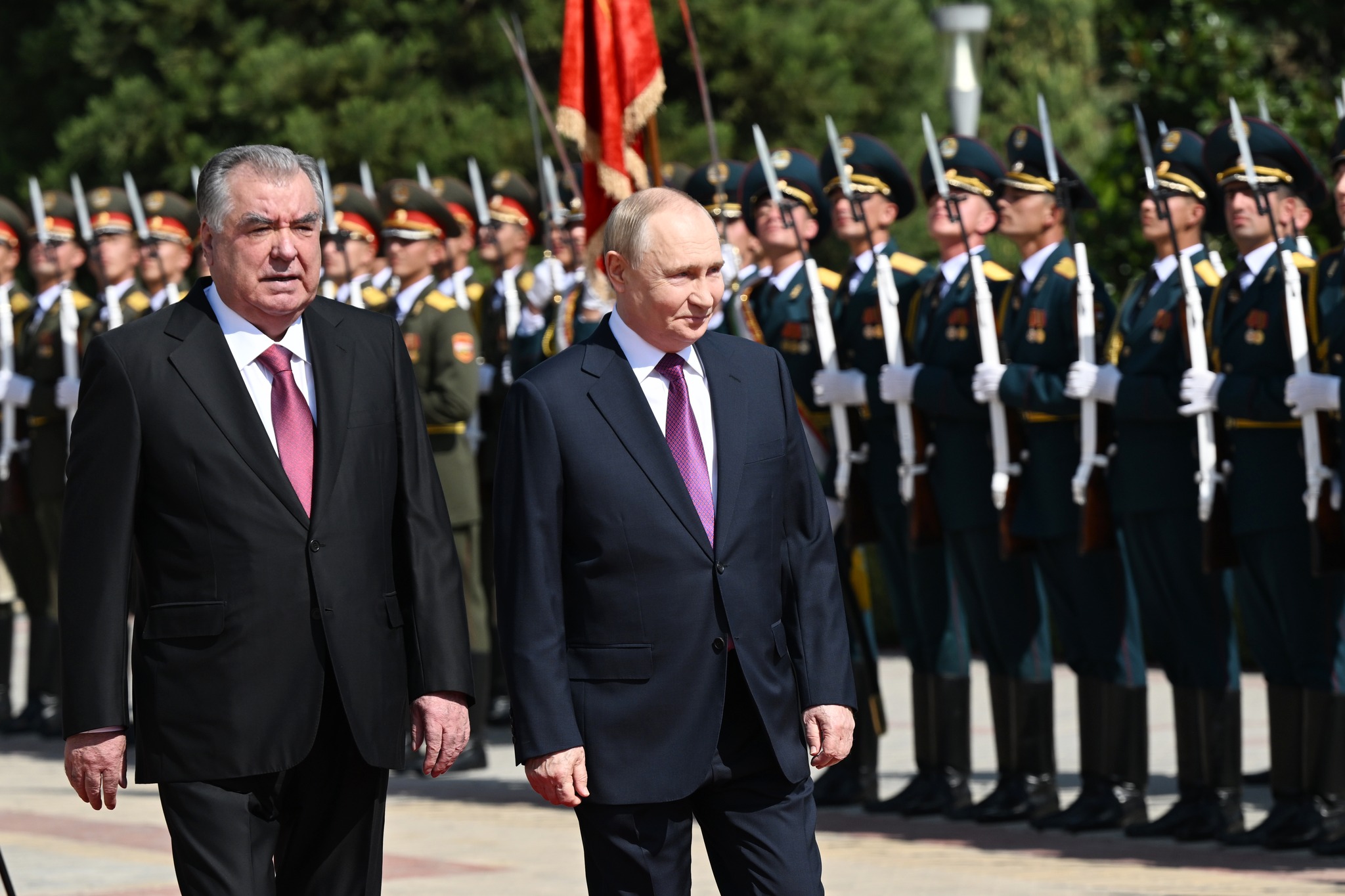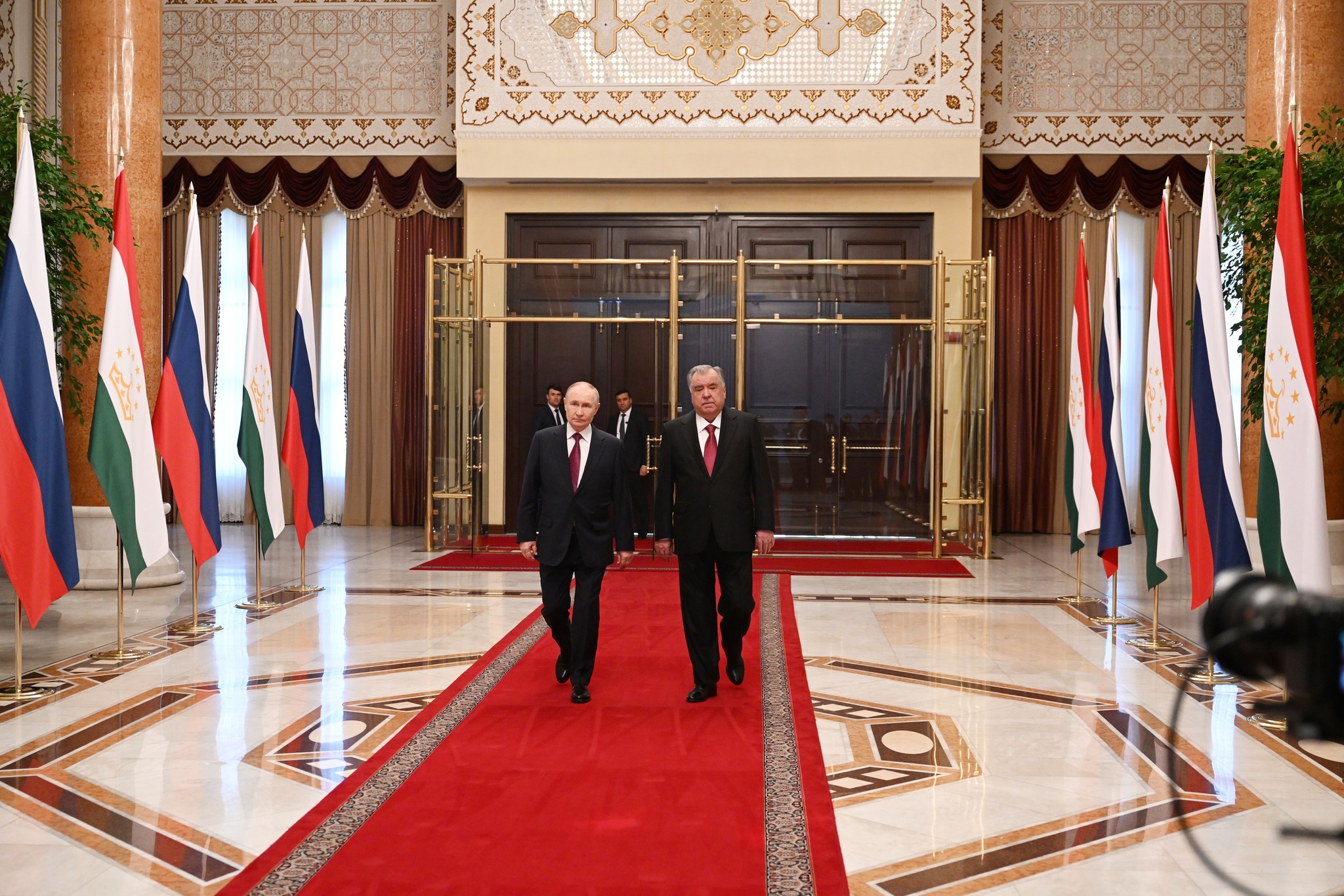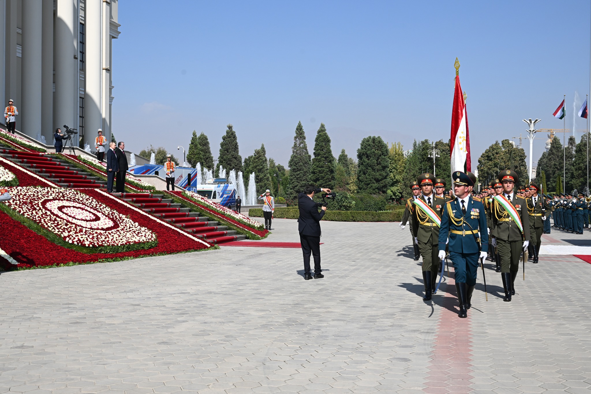 Пеш аз оғози гуфтушунидҳо, Эмомалӣ Раҳмон, Владимир Путинро дар майдони "Қасри миллат" пешвоз гирифт. Маросими истиқбол бо гузориши командири қаровули фахрӣ ба меҳмони воломақом, садо додани сурудҳои миллии ду кишвар, гузаштан аз назди сафи қаровули фахрӣ, арзи эҳтиром ба Парчами давлатии Тоҷикистон ва шиносоӣ бо ҳайатҳои расмии ду ҷониб ҷараён гирифт.